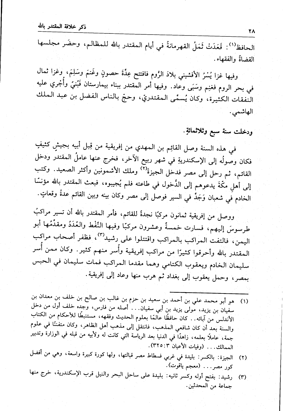 ودخلت سنة سبع وثلاثمائة : في هذه السنة وصل القائم بن المهدي من أفريقية من قبل أبيه بجيش كثيف فكان وصوله إلى الإسكندرية في شهر ربيع الآخر ، فخرج عنها عامل المقتدر ودخل القائم ، وثم رحل إلى مصر فدخل الجيزة وملك الأشمونين وأكثر الصعيد . وكتب إلى أهل مكة يدعوهم إلى الدخول في طاعته فلم يجيبوه ، فبعث المقتدر بالله مؤنساً الخادم في شعبان وجد في السير فوصل إلى مصر وكان بينه وبين القائم عدة وقعات .