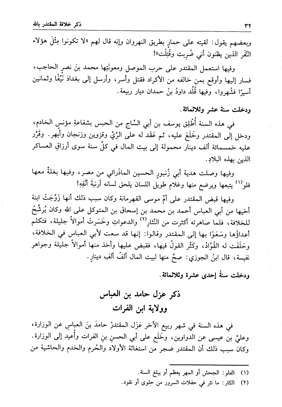 وفيها وصلت هدية أبي زنبورٍ الحسين الماذرائي من مصر ، وفيها بغلة معها فلو يتبعها ويرضع منها وغلام طويل اللسان يلحق لسانه أرنبة أنفه وفيها قبض المقتدر على أم موسى القهرمانة وكان سبب ذلك أنها زوجت ابنة أخيها من أبي العباس أحمد بن محمد بن إسحاق بن المتوكل على الله وكان يرشح للخلافة ، فلما صاهرته أكثرت من النثار والدعوات وخسرت أموالاً جليلة ، فتكلم أعداؤها وسعوا بها إلى المقتدر وقالوا : إنها قد سعت لأبي العباس في الخلافة ، وحلفت له القواد ، وكثر القول فيها ، فقبض عليها وأخذ منها أموالاً جليلة وجواهر نفيسة ، قال ابن الجوزيك صح منها لبيت المال ألف ألف دينار .