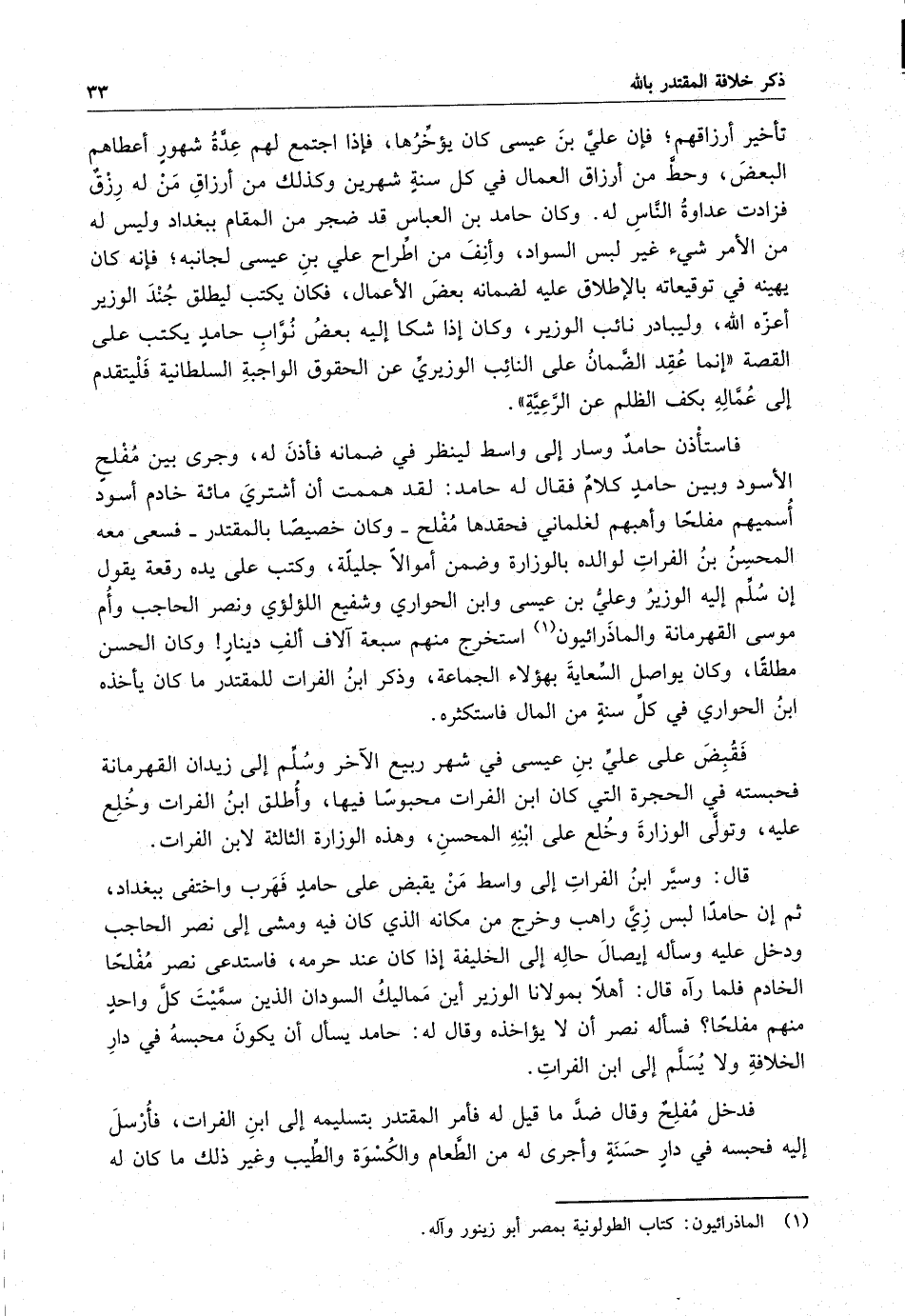 تأخير أرزاقهم ، فإن علي بن عيسى كان يؤخرها ، فإذا اجتمع لهم عدة شهور أعطاهم البعض ، وحط من أرزاق العمال في كل سنة شهرين وكذلك من أرزاق من له رزق فزادت عداوة الناس له . وكان حامد بن العباس قد ضجر في المقام ببغداد وليس له من الأمر شيء غير لبس السواد ، وأنف من إطراح علي بن عيسى لجانبه ، فإنه كان يهينه في توقيعاته بالإطلاق عليه لضمانه بعض الأعمال ، فكان يكتب ليطلق جند الوزير أعزه الله ، وليبادر نائب الوزير ، وكان إذا شكا إليه بعض نواب حامد يكتب على القصة إنما عقد الضمان على النائب الوزيري عن الحقوق الواجبة السلطانية فليتقدم إلى عماله بكف الظلم عن الرعية .