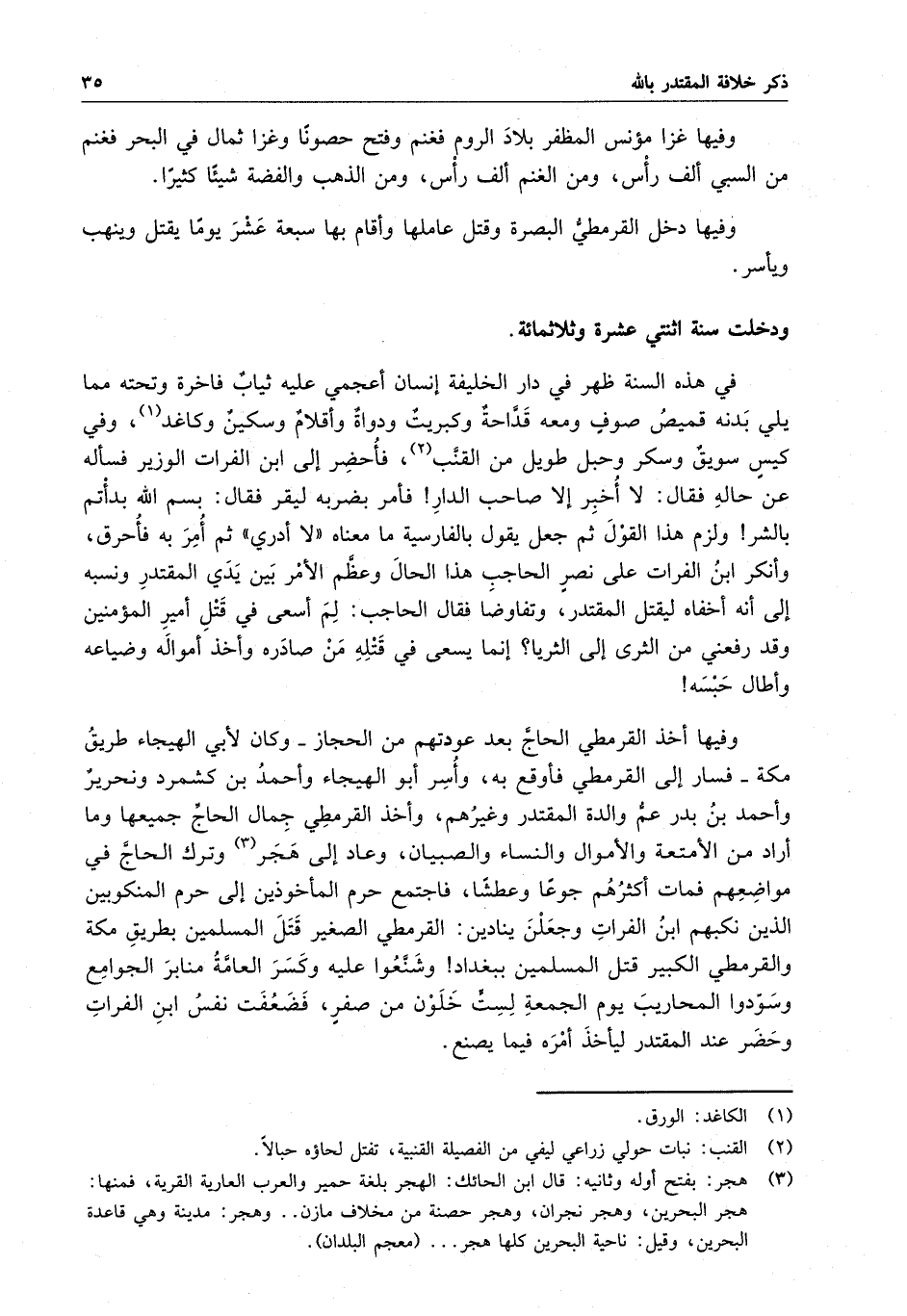 ودخلت سنة اثنتي عشرة وثلاثمائة : في هذه السنة ظهر في دار الخليفة إنسان أعجمي عليه ثياب فاخرة وتحته مما يلي بدنه قميص صوفٍ ومعه قداحةً وكبريت ودواة وأقلام وسكين وكاغد ، وفي كيس سويق وسكر وحبل طويل من القنب ، فأحضر إلى ابن الفرات الوزير فسأله عن حاله فقال : لا أخبر إلا صاحب الدار فأمر بضربة ليقر فقال : بسم الله بدأتم بالشر ولزم هذا القول ثم جعل يقول بالفارسية ما معناه لا أدري ثم أمر به فأحرق ، وأنكر ابن الفرات على نصر الحاجب هذا الحال وعظم الأمر بين يدي المقتدر ونسبه إلى أنه أخفاه ليقتل المقتدر ، وتفاوضاً فقال الحاجب : لم أسعى في قتل أمير المؤمنين وقد رفعني من الثرى إلى الثريا ؟ إنما يسعى في قتله من صادره وأخذ أمواله وضياعه وأطال حبسه وفيها أخذ القرمطي الحاج بعد عودتهم من الحجاز - وكان لأبي الهيجاء طريق مكة - فسار إلى القرمطي فأوقع به ، وأسر أبو الهيجاء وأحمد بن كشمرد ونحرير وأحمد بن بدر عم والدة المقتدر وغيرهم ، وأخذ القرمطي جمال الحاج جمعيها وما أراد من الأمتعة والأموال والنساء والصبيان ، وعاد إلى هجر وترك الحاج في مواضعهم فمات أكثرهم جوعاً وعطشاً ، فاجتمع حرم المأخوذين إلى حرم المنكوبين الذين نكبهم ابن الفرات وجعلن ينادين : القرمطي الصغير قتل المسلمين بطريق مكة والقرمطي الكبير قتل المسلمين ببغداد وشنعوا عليه وكسر العامة منابر الجوامع وسدوا المحاريب يوم الجمعة لست خلون من صفر ، فضعفت نفس ابن الفرات وحضر عند المقتدر ليأخذ أمره فيما يصنع .