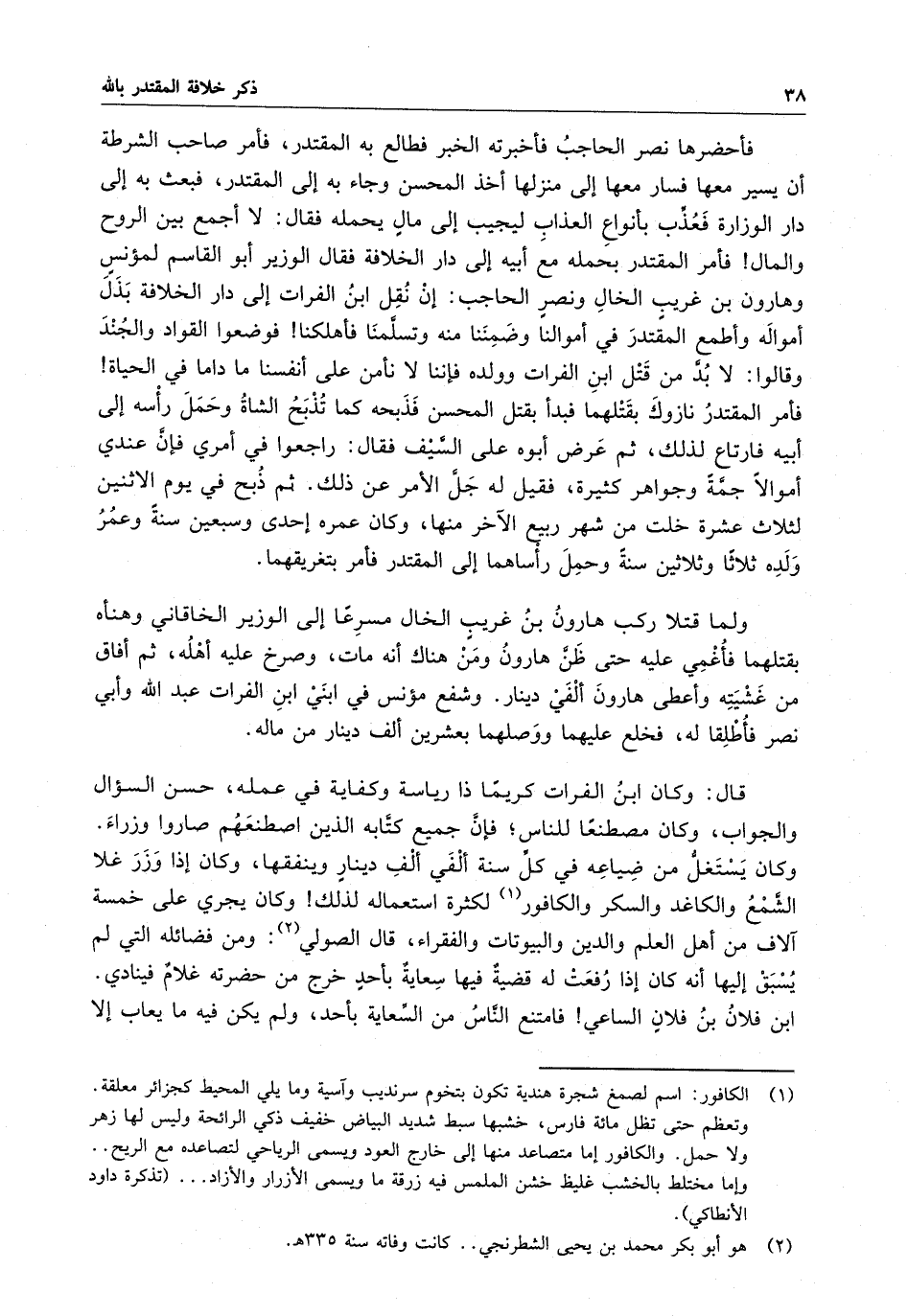 ولما قتلا ركب هارون بن غريب الخال مسرعاً إلى الوزير الخاقاني وهنأه بقتلهما فأغمي عليه حتى ظن هارون ومن هناك أنه مات ، وصرخ عليه أهله ، ثم أفاق من غشيته وأعطى هارون ألفي دينار . وشفع مؤنس في ابني ابن الفرات عبد الله وأبي نصر فأطلقا له ، فخلع عليهما ووصلهما بعشرين ألف دينار من ماله .