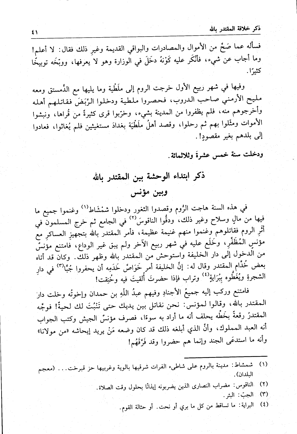 في هذه السنة هاجت الروم وقصدوا الثغور ودخلوا سمشاط وغنموا جميع ما فيها من مال وسلاح وغير ذلك ، ودقوا الناقوس في الجامع ثم خرج المسلمون في أثر الروم فقاتلوهم وغنموا منهم غنيمة عظيمة ، فأمر المقتدر بالله بتجهيز العساكر مع مؤنس المظفر ، وخلع عليه في شهر ربيع الآخر ولم يبق غير الوداع ، فامتنع مؤنس من الدخول إلى دار الخليفة واستوحش من المقتدر بالله وظهر ذلك . وكان قد أتاه بعض خدام المقتدر وقال له : إن الخليفة أمر خواص خدمه أن يحفروا جباً في دار الشجرة ويغطوه ببراية وتراب فإذا حضرت ألقيت فيه وخنقت فامتنع وركب إليه جميع الأجناد وفيهم عبد الله بن حمدان وإخوته وخلت دار المقتدر بالله ، وقالوا لمؤنس : نحن نقاتل بين يديك حتى تنتب لك لحية فوجه المقتدر رقعة بخطه يحلف أنه ما أراد به سوءاً ، فصرف مؤنس الجيش وكتب الجواب أنه العبد المملوك ، وأن الذي أبلغه ذلك قد كان وضعه من يريد إيحاشه من مولانا وأنه ما استدعى الجند وإنما هم حضروا وقد فرقهم