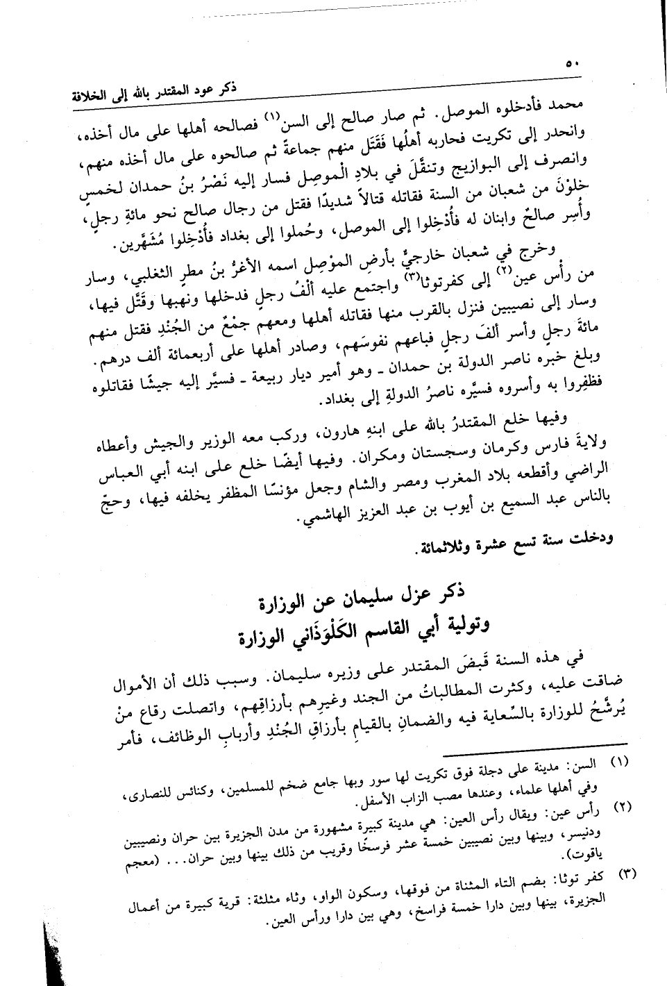 في هذه السنة قبض المقتدر على وزيره سليمان . وسبب ذلك أن الأموال ضاقت عليه ، وكثرت المطالبات من الجند وغيرهم بأرزاقهم ، واتصلت رقاع من يرشح للوزارة بالسعاية فيه والضمان بالقيام بأرزاق الجند وأرباب الوظائف ، فأمر