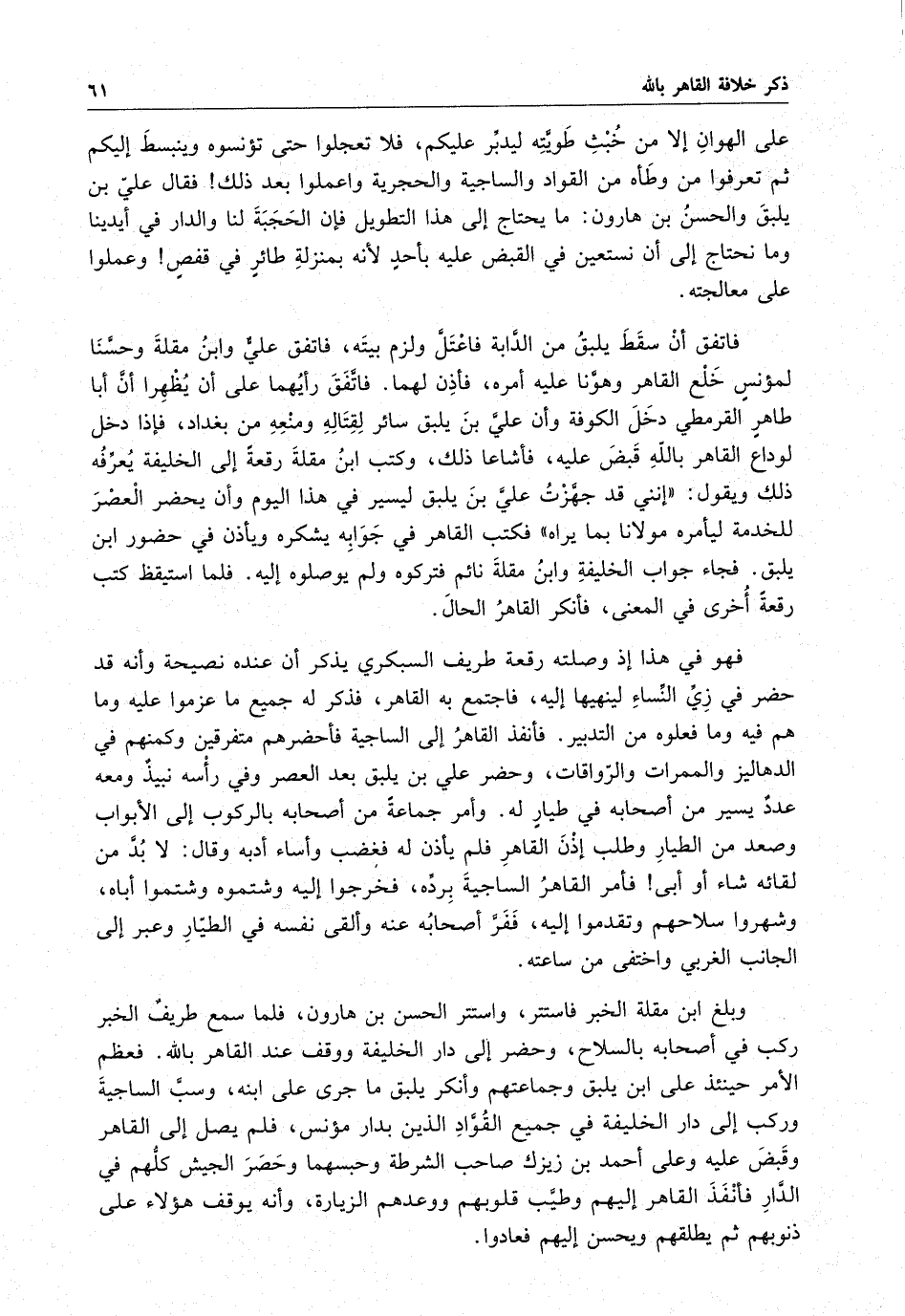 على الهوان إلا من خبث طويته ليدبر عليكم ، فلا تعجلوا حتى تؤنسوه وينبسط إليكم ثم تعرفوا من وطأة من القواد والساجية والحجرية واعملوا بعد ذلك فقال علي بن يلبق والحسنُ بن هارون : ما يحتاج إلى هذا التطويل فإن الحجبة لنا والدار في أيدينا وما نحتاج إلى أن نستعين في القبض عليه بأحد لأنه بمنزلة طائر في قفص وعملوا على معالجته . فاتفق أن سقط يلبق من الدابة فاعتل ولزم بيته ، فاتفق علي وابن مقفلة وحسناً لمؤنس خلع القاهر وهونا عليه أمره ، فأذن لهما فاتفق رأيهما على أن يظهرا أن أبا طاهر القرمطي دخل الكوفة وأن علي بن يلبق سائر لقتاله ومنعه من بغداد ، فإذا دخل لوداع القاهر بالله قبض عليه ، فأشاعا ذلك ، وكتب ابن مقلة رقعة إلى الخليفة يعرفه ذلك ويقول : إنني قد جهزت علي بن بلبق ليسير في هذا اليوم وأن يحضر العصر للخدمة ليأمره مولانا بما يراه فكتب القاهر في جوابه يشكره ويأذن في حضور ابن يلبق . فجاء جواب الخليفة وابن مقلة نائم فتركوه ولم يوصلوه إليه . فلما استيقظ كتب رقعة أخرى في المعنى ، فأنكر القاهر الحال .
