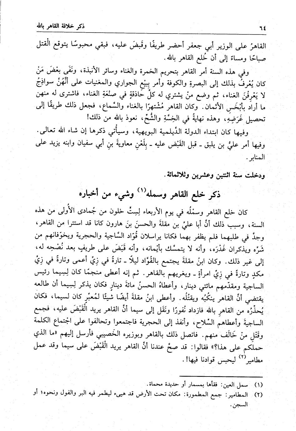 وفي هذه السنة أمر القاهر بتحريم الخمرة والغناء وسائر الأنبذة ، ونفي بعض من كان يعرف بذلك إلى البصرة والكوفة وأمر ببيع الجواري والمغنيات على أنهن سواذج لا يعرفن الغناء ، ثم وضع من يشتري له كل حاذقة في صنعة الغناء ، فاشترى له منهن ما أراد بأبخس الأثمان . وكان القاهر مشتهراً بالغناء والسماع ، فجعل ذلك طريقاً إلى تحصيل غرضه ، وهذه نهاية في الخسة والشح ، نعوض بالله من ذلك وفيها كان ابتداء الدولة الديلمية البويهية ، وسيأتي ذكرها إن شاء الله تعالى . وفيها أمر علي بن يلبق - قبل القبض عليه - بلعن معاوية بن أبي سفيان وابنه يزيد على المنابر .