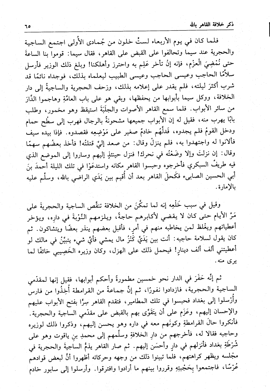 ثم إنه حفر في الدار نحو خمسين مطمورة وأحكم أبوابها ، فقيل إنها لمقدمي الساجية والحجرية ، فازدادوا نفوراً ، ثم إن جماعة من القرامطة أخذوا من فارس وأرسلوا إلى بغداد فحبسوا في تلك المطامير ، فتقدم القاهر سراً بفتح الأبواب عليهم والإحسان إليهم ، وعزم على أن يتقوى بهم بالقبض على مقدمي الساجية والحجرية . فأنكروا حال القرامطة وكونهم معه في داره وهو يحسن إليهم ، وذكروا ذلك لوزيره وحاجبه فقالا له ، فأخرجهم من دار الخلافة وسلمهم إلى محمد بن ياقوت وهو على شرطة بغداد فأنزلهم في دارٍ وأحسن إليهم . ثم صار القاهر يذم الساجية والحجرية في مجلسه ويظهر كراهتهم ، فلما تبينوا ذلك من وجهه وحركاته أظهروا أن لبعض قوادهم عرسا ، فاجتمعوا بحجبته وقرروا بينهم ما أرادوا وافترقوا . وأرسلوا إلى سابور خادم