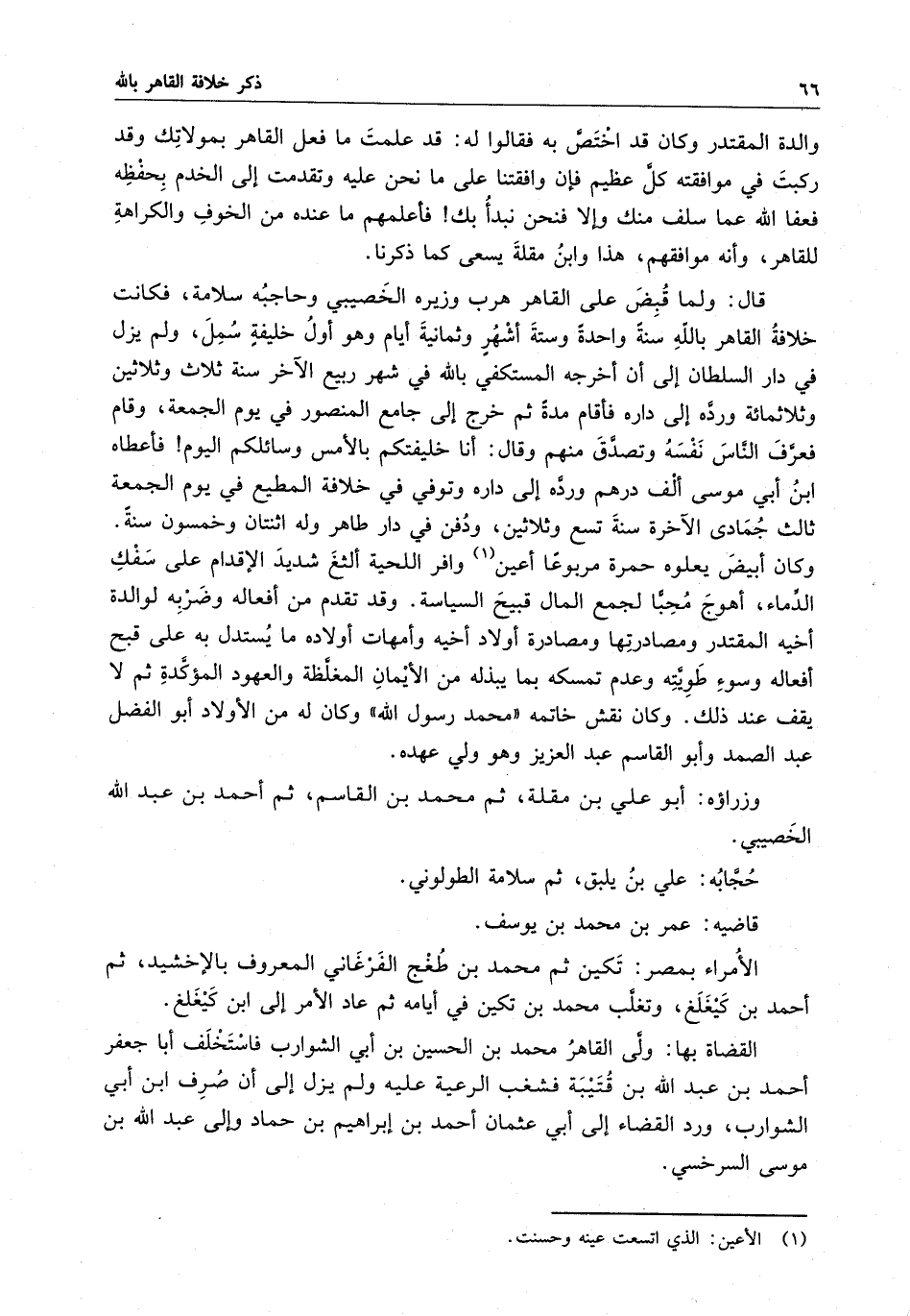 قال : ولما قبض على القاهر هرب وزيره الخصيبي وحاجبه سلامة ، فكانت خلافة القاهر بالله سنة واحدة وستة أشره وثمانية أيام وهو أول خليفة سمل ، ولم يزل في دار السلطان إلى أن أخرجه المستكفي بالله في شهر ربيع الآخر سنة ثلاث وثلاثين . وثلاثمائة ورده إلى داره فأقام مدة ثم خرج إلى جامع المنصور في يوم الجمعة ، وقام فعرف الناس نفسه وتصدق منهم وقال : أنا خليفتكم بالأمس وسائلكم اليوم فأعطاه ابن أبي موسى ألف درهم وورده إلى داره وتوفي في خلافة المطيع في يوم الجمعة ثالث جمادى الآخرة سنة تسع وثلاثين ، ودفن في دار طاهر وله اثنتان وخمسون سنة . وكان أبيض يعلوه حمرة مربوعاً أعين وافر اللحية ألثغ شديد الإقدام على سفك الدماء ، أهوج محباً لجمع المال قبيح السياسة . وقد تقدم من أفعاله وضربه لوالدة أخيه المقتدر ومصادرتها ومصادرة أولاد أخيه وأمهات أولاده ما يستدل به على قبح أفعاله وسوء طويته وعدم تمسكه بما يبذله من الأيمان المغلظة والعهود المؤكدة ثم لا يقف عند ذلك . وكان نقش خاتمه محمد رسول الله وكان له من الأولاد أبو الفضل عبد الصمد وأبو القاسم عبد العزيز وهو ولي عهده .