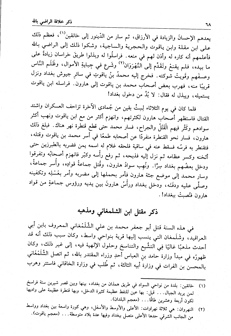 يعدهم الإحسان والزيادة في الأرزاق ، ثم سار من الدينور إلى خانقين ، فعظم ذلك على ابن مقلة وابن ياقوت والحجرية والساجية ، وشكوا ذلك إلى الراضي بالله فأعلمهم أنه كاره له وأذن لهم في منعه . فراسلوا له وبذلوا طريق خراسان زيادة على ما بيده ، فلم يقنع وتقدم إلى النهروان وشرع في جباية الأموال ، وظلم الناس ، وسفهم وقويت شوكته . فخرج إليه محمد بن ياقوت في سائر جيوش بغداد ونزل قريباً منه ، فهرب بعض أصحاب محمد ابن ياقوت إلى هارون . فراسله ابن ياقوت يستميله ، ويبذل له فقال : لا بد من دخول بغداد فلما كان في يوم الثلاثاء لست بقين من جمادى الآخرة تزاحف العسكران واشتد القتال فاستظهر أصحاب هارون لكثرتهم ، وانهزم أكثر من مع ابن ياقوت ونهب أكثر سوادهم وكثر فيهم القتل والجراح ، فسار محمد حتى قطع قنطرة نهر هناك . فبلغ ذلك هارون ، فسار نحو القنطرة منفرداً عن أصحابه طمعاً في أسر محمد بن ياقوت وقتله ، فتقنطر به فرسه فسقط عنه في ساقية فلحقه غلام له اسمه يمن فضربه بالطبرزين حتى أثخنه وكسر عظامه ثم نزل إليه فذبحه ، ثم رفع رأسه وكبر فانهزم أصحابه وتفرقوا ودخل بعضهم بغداد سراً . ونهب سوادُ هارون ، وقتل جماعة قواده ، وأسر جماعة ، وسار محمد إلى موضع جثة هارون فأمر بحملها إلى مضربه وأمر بغسله وتكفينه وصلى عليه ودفنه ، ودخل بغداد وراس هارون بين يديه ورؤوس جماعة من قواد هارون فنصبت ببغداد