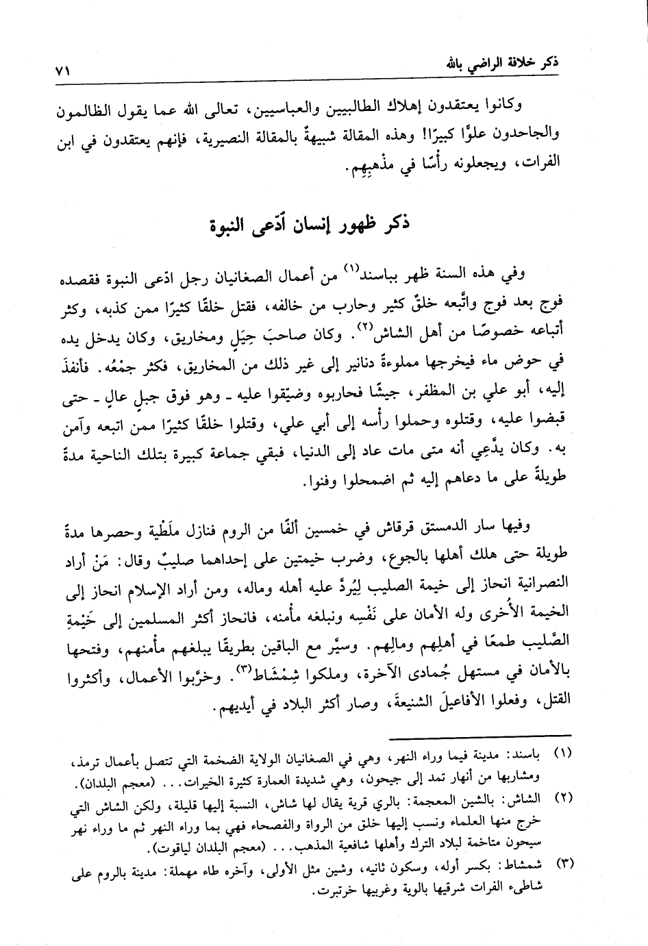 وفي هذه السنة ظهر بباسند من أعمال الصغانيان رجل ادعى النبوة فقصده فوج بعد فوج واتبعه خلق كثير وحارب من خالفه ، فقتل خلقاً كثيراً ممن كذبه ، وكثر أتباعه خصوصاً من أهل الشاش . وكان صاحب حيل ومخاريق ، وكان يدخل يده في حوض ماء فيخرجها مملوءة دنانير إلى غير ذلك من المخاريق ، فكثر جمعه . فأنفذ إليه ، أبو علي بن المظفر ، جيشاً فحاربوه وضيقوا عليه - وهو فوق جبلٍ عالٍ - حتى قبضوا عليه ، وقتلوه وحملوا رأسه إلى أبي علي ، وقتلوا خلقاً كثيراً ممن ابتعه وآمن به . وكان يدعي أنه متى مات عاد إلى الدنيا ، فبقي جماعة كبيرة بتلك الناحية مدة طويلة على ما دعاهم إليه ثم اضمحلوا وفنوا .