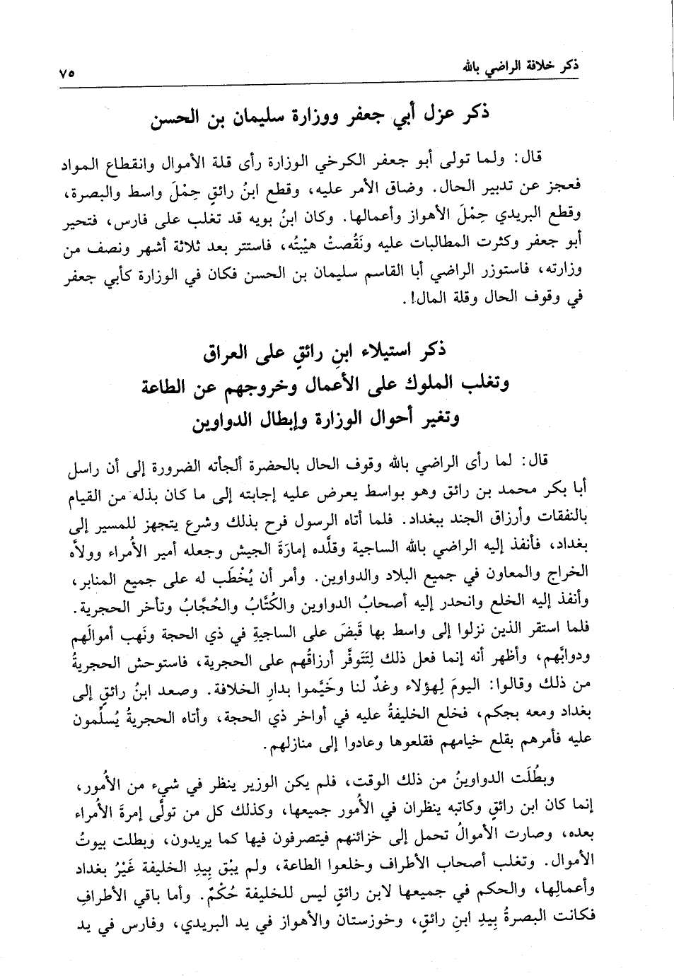 قال : ولما تولى أبو جعفر الكرخي الوزارة رأى قلة الأموال وانقطاع المواد فعجز عن تدبير الحال ، وضاق الأمر عليه ، وقطع ابن رائقٍ حمل واسط والبصرة ، وقطع البريدي حمل الأهواز وأعمالها . وكان ا بن بريه قد تغلب على فارس ، فتحير أبو جعفر وكثرت المطالبات عليه ونقضت هيبته ، فاستتر بعد ثلاثة أشهر ونصف من وزارته ، فاستوزر الراضي أبا القاسم سليمان بن الحسن فكان في الوزارة كأبي جعفر في وقوف الحال وقلة المال