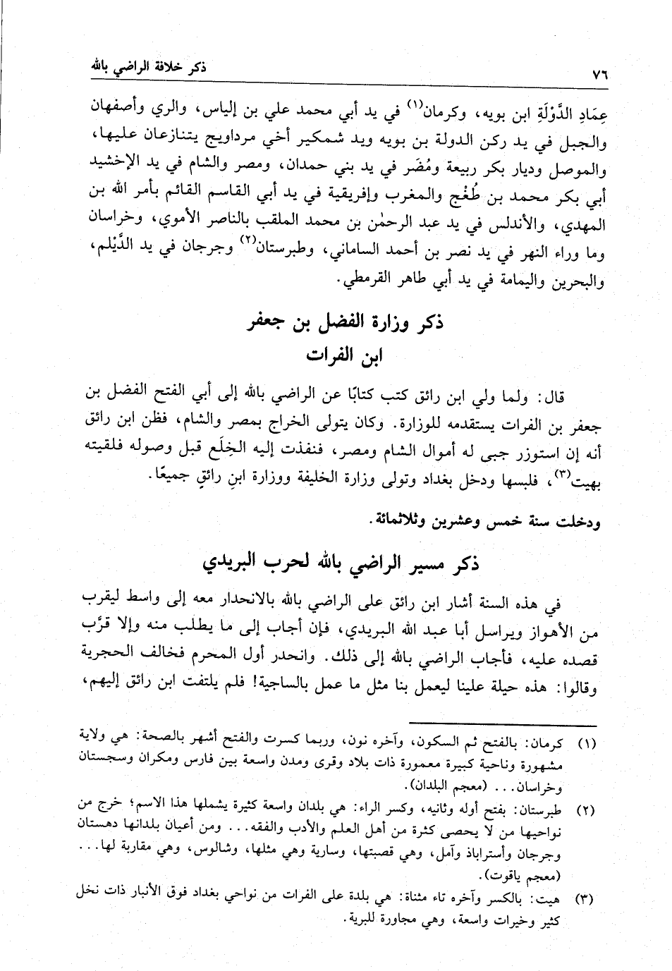 قال : ولما ولي ابن رائق كتب كتاباً عن الراضي بالله إلى أبي الفتح الفضل بن جعفر بن الفرات يستقدمه للوزارة . وكان يتولى الخراج بمصر والشام ، فظن ابن رائق أنه إن استوزر جبي له أموال الشام ومصر ، فنفذت إليه الخلع قبل وصوله فلقيته بهيت ، فلبسها ودخل بغداد وتولى وزارة الخليفة ووزارة ابن رائق جميعاً .