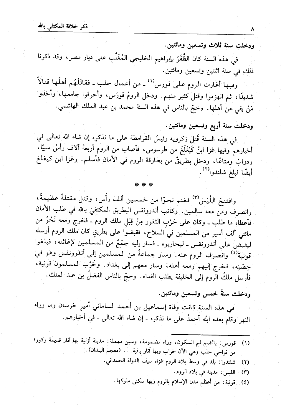 وافتتح الليس فغنم نحواً من خمسين ألف رأس ، وقتل مقتله عظيمة ، وانصرف ومن معه سالمين . وكاتب اندرونقس البطريق المكتفي بالله في طلب الأمان فأعطاه ما طلب - وكان على حرب الثغور من قبل ملك الروم - فخرج ومعه نحو من مائتي ألف أسير من المسلمين في السلاح ، فقبضوا على بطريق كان ملك الروم أرسله ليقبض على أندرونقس - ليحاربوه - فسار إليه جمع من المسلمين لإغاثته ، فبلغوا قونية انصرف الروم عنه . وسار جماعة من المسلمين إلى أندرونقس وهو في حصنه ، فخرج إليهم ومعه أهله ، وسار معهم إلى بغداد . وخرب المسلمون قونية ، فأرسل ملك الروم إلى الخليفة يطلب الفداء . وحج بالناس الفضل بن عبد الملك .