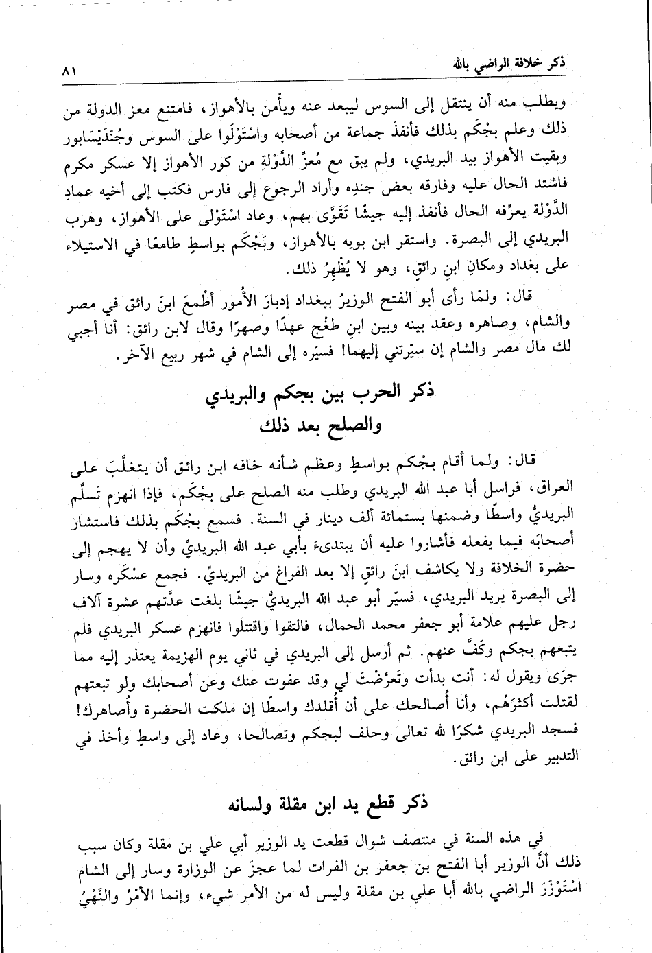 قال : ولما أقام بجكم بواسط وعظم شأنه خافه ابن رائق أن يتغلب على العراق ، فراسل عبد الله البريدي وطلب منه الصلح على بجكم ، فإذا انهزم تسلم البريدي واسطاً وضمنها بستمائة ألف دينار في السنة . فسمع بجكم بذلك فاستشار أصحابه فيما يفعله فأشاروا عليه أن يبتدي بأبي عبد الله البريدي وأن لا يهجم إلى حضرة الخلافة ولا يكاشف ابن رائق إلا بعد الفراغ من البريدي . فجمع عسكره وسار إلى البصرة يريد البريدي ، فسير أبو عبد الله البريدي جيشاً بلغت عدتهم عشرة آلاف رجل عليهم علامة أبو جعفر محمد الحمال ، فالتقوا واقتتلوا فانهزم عسكر البريدي فلم يتبعهم بجكم وكف عنه . ثم أرسل إلى البريدي في ثاني يوم الهزيمة يعتذر إليه مما جرى ويقول له : أنت بدأت وتعرضت لي وقد عفوت عنك وعن أصحابك ولو تبعتهم لقتلت أكثرهم ، وأنا أصالحك على أن أقلدك واسطاً إن ملكت الحضرة وأصاهرك فسجد البريدي شكر الله تعالى وحلف لبجكم وتصالحاً ، وعاد إلى واسط وأخذ في التدبير على ابن رائق .