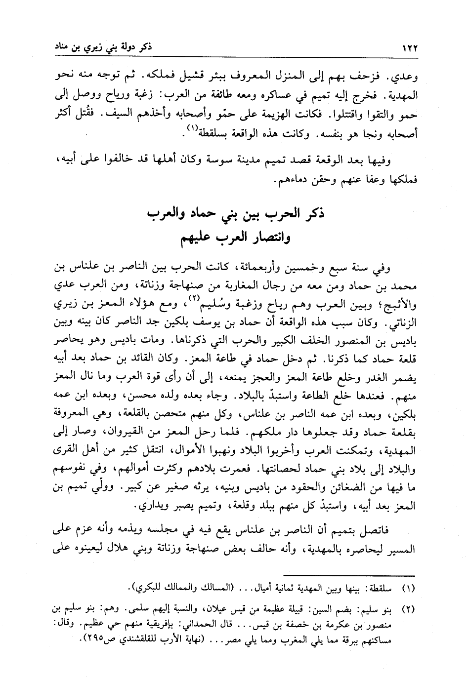 وفي سنة سبع وخمسين وأربعمائة ، كانت الحرب بين الناصر ابن علناس بن محمد بن حماد ومن معه من رجال المغاربة من صنهاجة وزناتة ، ومن العرب عدي والأثبج ؛ وبين العرب وهم رياح وزغبة وسليم ، ومع هؤلاء المعز بن زيري الزناتي . وكان سبب هذه الواقعة أن حماد بن يوسف بلكين جد الناصر كان بينه وبين باديس بن المنصور الخلف الكبير والحرب التي ذكرناها . ومات باديس وهو يحاصر قلعة حماد كما ذكرنا . ثم دخل حماد في طاعة المعز . وكان القائد بن حماد بعد أبيه يضمر الغدر وخلع طاعة المعز والعجز يمنعه ، إلى أن رأى قوة العرب وما نال المعز منهم . فعندها خلع الطاعة واستبد بالبلاد . وجاء بعده ولده محسن ، وبعده ابن عمه بلكين ، وبعده ابن عمه الناصر بن علناس ، وكل منهم متحصن بالقلعة ، وهي المعروف بقلعة حماد وقد جعلوها دار ملكهم . فلما رحل المعز من القيروان ، وصار إلى المهدية ، وتمكنت العرب وأخربوا البلاد ونهبوا الأموال ، انتقل كثير من أهل القرى والبلاد إلى بلاد بني حماد لحصانتها ، فعمرت بلادهم وكثرت أموالهم ، وفي نفوسهم ما فيها من الضغائن والحقود من باديس وبنيه ، يرثه صغير عن كبير . وولي تميم بن المعز بعد أبيه ، واستبد كل منهم ببلد وقلعة ، وتميم يصبر ويداري . فاتصل بتميم أن الناصر بن علناس يقع فيه في مجلسه ويذمه وأنه عزم على المسير ليحاصره بالمهدية ، وأنه حالف بعض صنهاجة وزناتة وبني هلال ليعينوه على