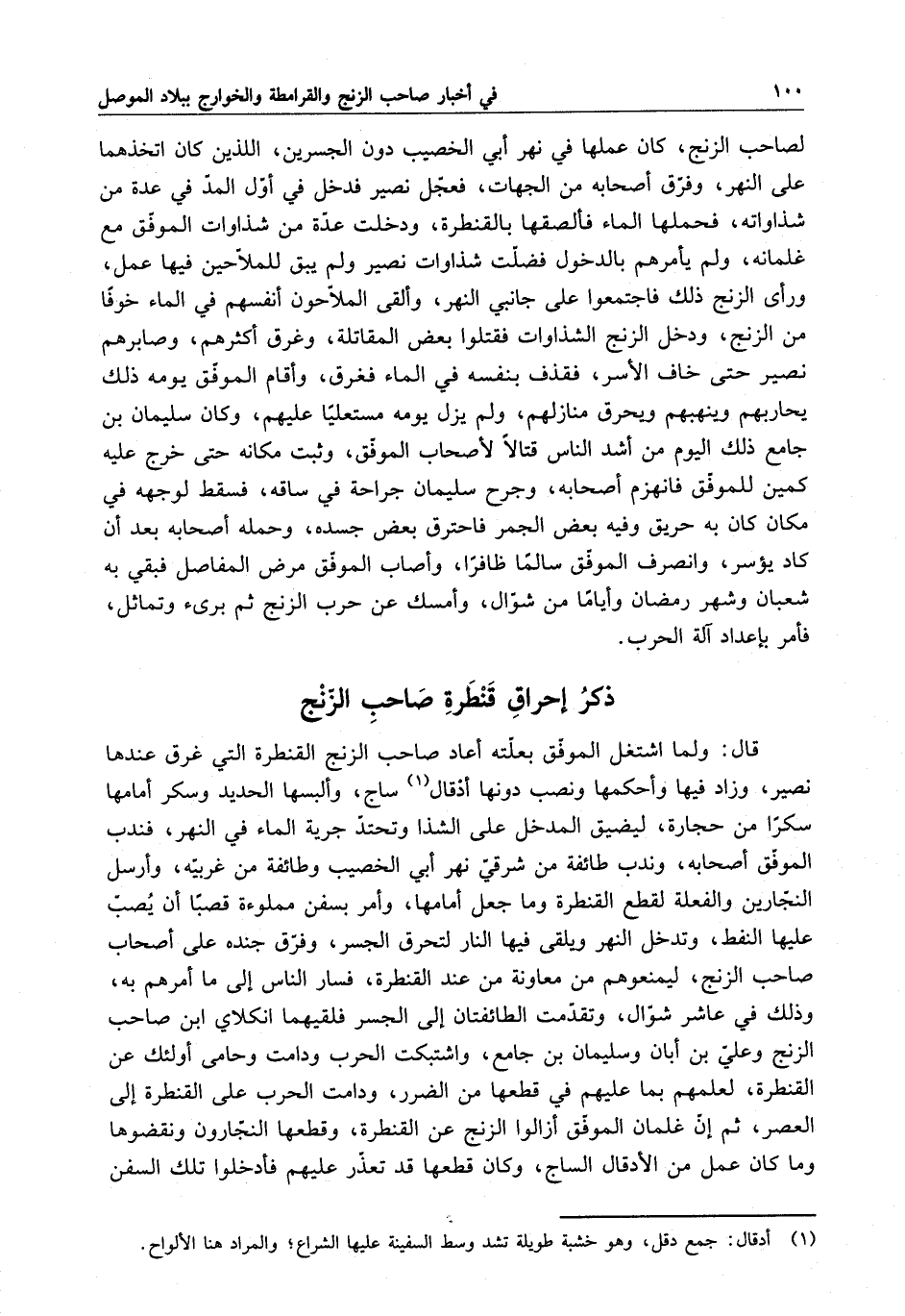 قال : ولما اشتغل الموفق بعلته أعاد صاحب الزنج القنطرة التي غرق عندها نصير ، وزاد فيها وأحكمها ونصب دونها أدقال ساج ، وألبسها الحديد وسكر أمامها سكراً من حجارة ، ليضيق المدخل على الشذا وتحتد جرية الماء في النهر ، فندب الموفق أصحابه ، وندب طائفة من شرقي نهر أبي الخصيب وطائفة من غربيه ، وأرسل النجارين والفعلة لقطع القنطرة وما جعل أمامها ، وأمر بسفن مملوءة قصباً أن يصب عليها النفط ، وتدخل النهر ويلقى فيها النار لتحرق الجسر ، وفرق جنده على أصحاب صاحب الزنج ، ليمنعوهم من معاونة من عند القنطرة ، فسار الناس إلى ما أمرهم به ، وذلك في عاشر شوال ، وتقدمت الطائفتان إلى الجسر فلقيهما أنكلاى ابن صاحب الزنج وعلي بن أبان وسليمان بن جامع ، واشتبكت الحرب ودامت وحامى أولئك عن القنطرة ، لعلمهم بما عليهم في قطعها من الضرر ، ودامت الحرب على القنطرة إلى العصر ، ثم إن غلمان الموفق أزالوا الزنج عن القنطرة ، وقطعها النجارون ونقضوها وما كان عمل من الأدقال الساج ، وكان قطعها قد تعذر عليهم فأدخلوا تلك السفن