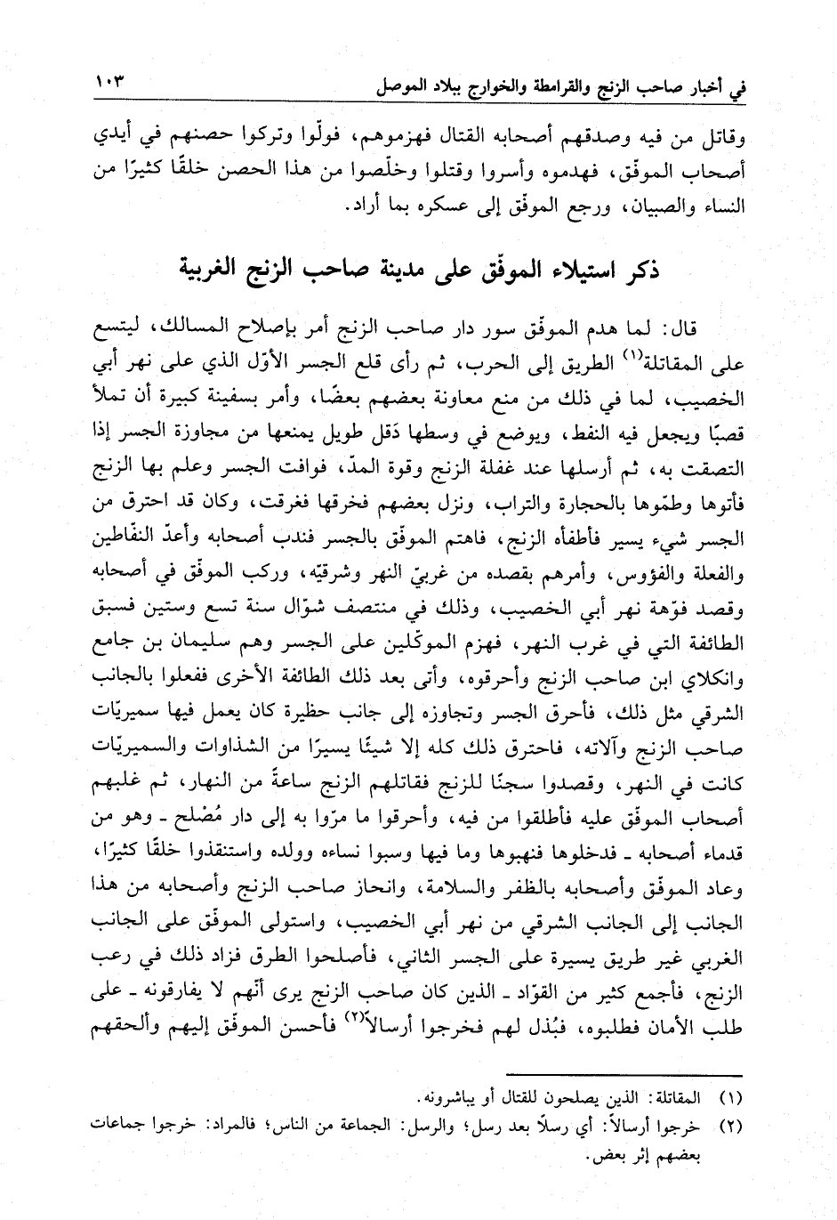 قال : لما هدم الموفق سور صاحب الزنج أمر بإصلاح المسالك ، ليتسع على المقاتلة الطريق إلى الحرب ، ثم رأى قلع الجسر الأول الذي على نهر أبي الخصيب ، لما في ذلك من منع معاونة بعضهم بعضاً ، وأمر بسفينة كبيرة أن تملأ قصباً ويجعل فيه النفط ، ويوضع في وسطها دقل طويل يمنعها من مجاوزة الجسر إذا التصقت به ، ثم أرسلها عند غفلة الزنج وقوة المد ، فوافت الجسر وعلم بها الزنج فأتوها وطموها بالحجارة والتراب ، ونزل بعضهم فخرقها فعرقت ، وكان قد احترق من الجسر شيء يسير فأطفأه الزنج ، فاهتم الموفق بالجسر فندب أصحابه وأعد النفاطين والفعلة والفؤوس ، وأمرهم بقصده من غربيّ النهر وشرقيّة ، وركب الموّفق في أصحابه وقصد فوّهة نهر أبي الخصيب ، وذلك في منتصف شوال سنة تسع وستين فسبق الطائفة التي في غرب النهر ، فهزم الموكلين على الجسر وهم سليمان بن جامع وانكلاى ابن صاحب الزنج وأحرقوه ، وأتى بعد ذلك الطائفة الأخرى ففعلوا بالجانب الشرقي مثل ذلك ، فأحرق الجسر وتجاوزه إلى جانب حظيرة كان يعمل فيها سميريات صاحب الزنج وآلاته ، فاحترق ذلك كله إلا شيئاً يسيراً من الشذاوات والسميريات كانت في النهر ، وقصدوا سجناً للزنج فقاتلهم الزنج ساعة من النهار ، ثم غلبهم أصحاب الموفق عليه فأطلقوا من فيه ، وأحرقوا ما مروا به إلى دار مصلح - وهو من قدماء أصحابه - فدخلوها فنهبوها وما فيها وسبوا نساءه وولده واستنفذوا خلقاً كثيراً ، وعاد الموفق وأصحابه بالظفر والسلامة ، وانحاز صاحب الزنج وأصحابه من هذا الجانب إلى الجانب الشرقي من نهر أبي الخصيب ، واستولى الموفق على الجانب الغربي غير طريق يسيرة على الجسر الثاني ، فأصلحوا الطرق فزاد ذلك في رعب الزنج ، فأجمع كثير من القواد - الذين كان صاحب الزنج يرى أنهم لا يفارقونه - على طلب الأمان فطلبوه ، فبذل لهم فخرجوا أرسالاً فأحسن الموفق إليهم وألحقهم