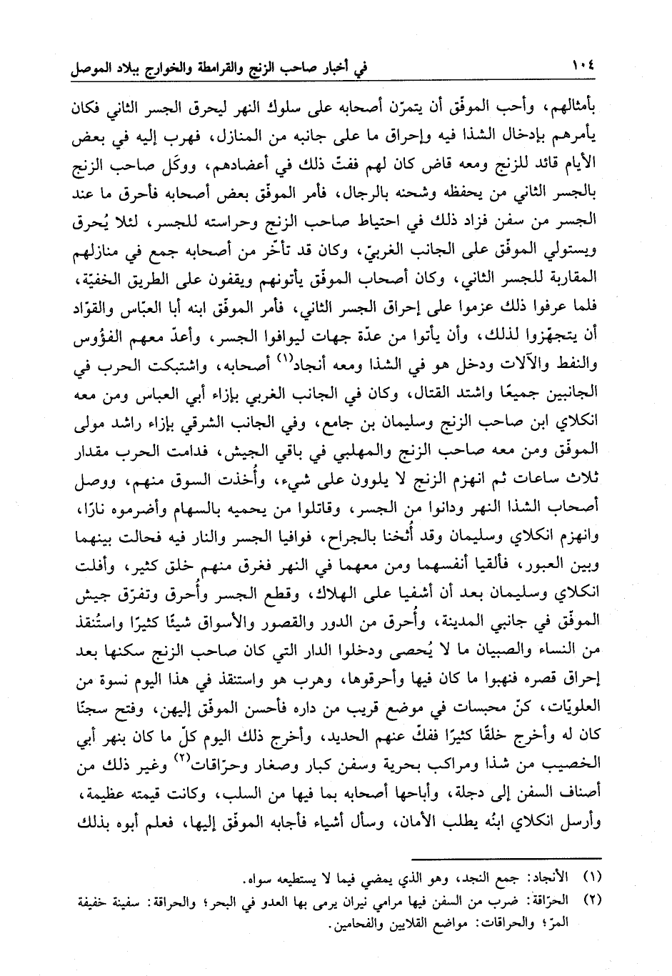 بأمثالهم ، وأحب الموفق لأن يتمرن أصحابه على سلوك النهر ليحرق الجسر الثاني فكان يأمرهم بإدخال الشذا فيه وإحراق ما على جانبه من المنازل ، فهرب إليه في بعض الأيام قائد للزنج ومعه قاض كان لهم ففت ذلك في أعضادهم ، ووكل صاحب الزنج بالجسر الثاني من يحفظه وشحنه بالرجال ، فأمر الموفق بعض أصحابه فأحرق ما عند الجسر من سفن فزاد ذلك في احتياط صاحب الزنج وحراسته للجسر ، لئلا يحرق ويستولي الموفق على الجانب الغربي ، وكان قد تأخر من أصحاب جمع في منازلهم المقاربة للجسر الثاني ، وكان أصحاب الموفق يأتونهم ويقفون على الطريق الخفية ، فلما عرفوا ذلك عزموا على إحراق الجسر الثاني ، فأمر الموفق ابنه أبا العباس والقواد أن يتجهزوا لذلك ، وأن يأتوا من عدة جهات ليوافوا الجسر ، وأعد معهم الفؤوس والنفط والآلات ودخل هو في الشذا ومعه أنجاد أصحابه ، واشتبكت الحرب في الجانبين جميعاً واشتد القتال ، وكان في الجانب الغربي بإزاء أبي العباس ومن معه أنكلاى ابن صاحب الزنج وسليمان بن جامع ، وفي الجانب الشرقي بإزاء راشد مولى الموفق ومن معه صاحب الزنج والمهلبي في باقي الجيش ، فدامت الحرب مقدار ثلاث ساعات ثم انهزم الزنج لا يلوون على شيء وأخذت السوق منهم ، ووصل أصحاب الشذا النهر ودانوا من الجسر ، وقاتلوا من يحميه بالسهام وأضرموه ناراً ، وانهزم انكلاى وسليمان وقد أثخنا بالجراح ، فوافيا الجسر والنار فيه فحالت بينهما وبين العبور ، فألقيا أنفسهما ومن معهما في النهر فغرق منهم خلق كثير ، وأفلت انكلاى وسليمان بعد أن أشفيا على الهلاك ، وقطع الجسر وأحرق وتفرق جيش الموفق في جانبي المدينة ، وأحرق من الدور والقصور والأسواق شيئاً كثيراً واستنفذ من النساء والصبيان ما لا يحصى ودخلوا الدار التي كان صاحب الزنج سكنها بعد إحراق قصره فنهبوا ما كان فيها وأحرقوها ، وهرب هو واستنفذ في هذا اليوم نسوة من العلويات ، كن محبسات في موضع قريب من داره فأحسن الموفق إليهن ، وفتح سجناً كان له وأخرج خلقاً كثيراً ففك عنهم الحديد ، وأخرج ذلك اليوم كل ما كان بنهر أبي الخصيب من شذا ومراكب بحرية وسفن كبار وصغار وحراقات وغير ذلك من أصناف السفن إلى دجلة ، وأباحها أصحابه بما فيها من السلب ، وكانت قيمته عظيمة ، وأرسل انكلاى ابنه يطلب الأمان ، وسأل أشياء فأجابه الموفق إليها ، فعلم أبوه بذلك