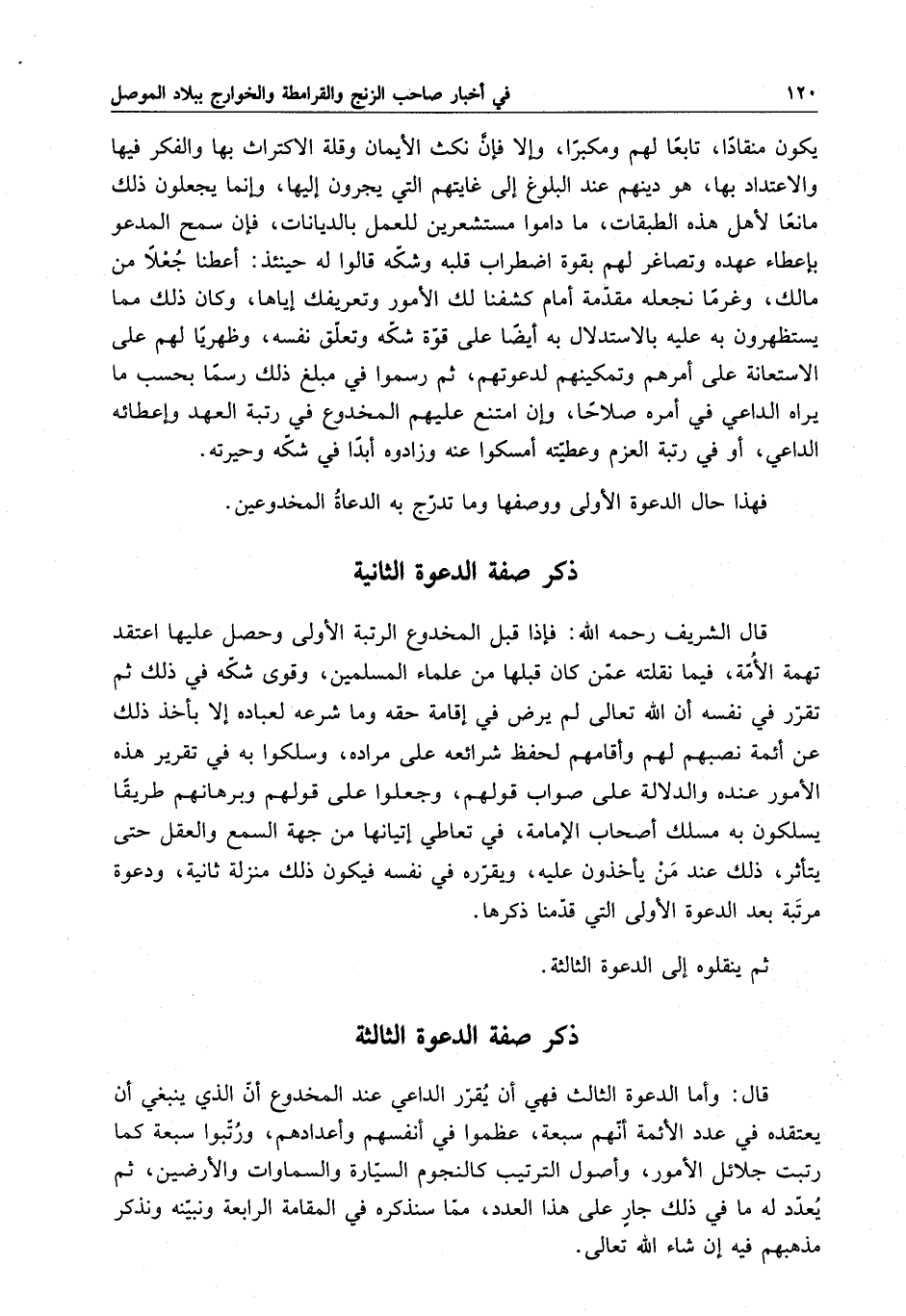 قال الشريف رحمه الله : فإذا قبل المخدوع الرتبة الأولى وحصل عليها اعتقد تهمة الأمة ، فيما نقلته عمن كان قبلها من علماء المسلمين ، وقوى شكه في ذلك ثم تقرر في نفسه أن الله تعالى لم يرض في إقامة حقه وما شرعه لعباده إلا بأخذ ذلك عن أئمة نصبهم لهم وأقامهم لحفظ شرائعه على مراده ، وسلكوا به في تقرير هذه الأمور عنده والدلالة على صواب قولهم ، وجعلوا على قولهم برهانهم طريقاً يسلكون به مسلك أصحاب الإمامة ، في تعاطي أتيانها من جهة السمع والعقل حتى يتأثر ، ذلك عند من يأخذون عليه ، ويقرره في نفسه فيكون ذلك منزلة ثانية ، ودعوة مرتبة بعد الدعوة الأولى التي قدمنا ذكرها .