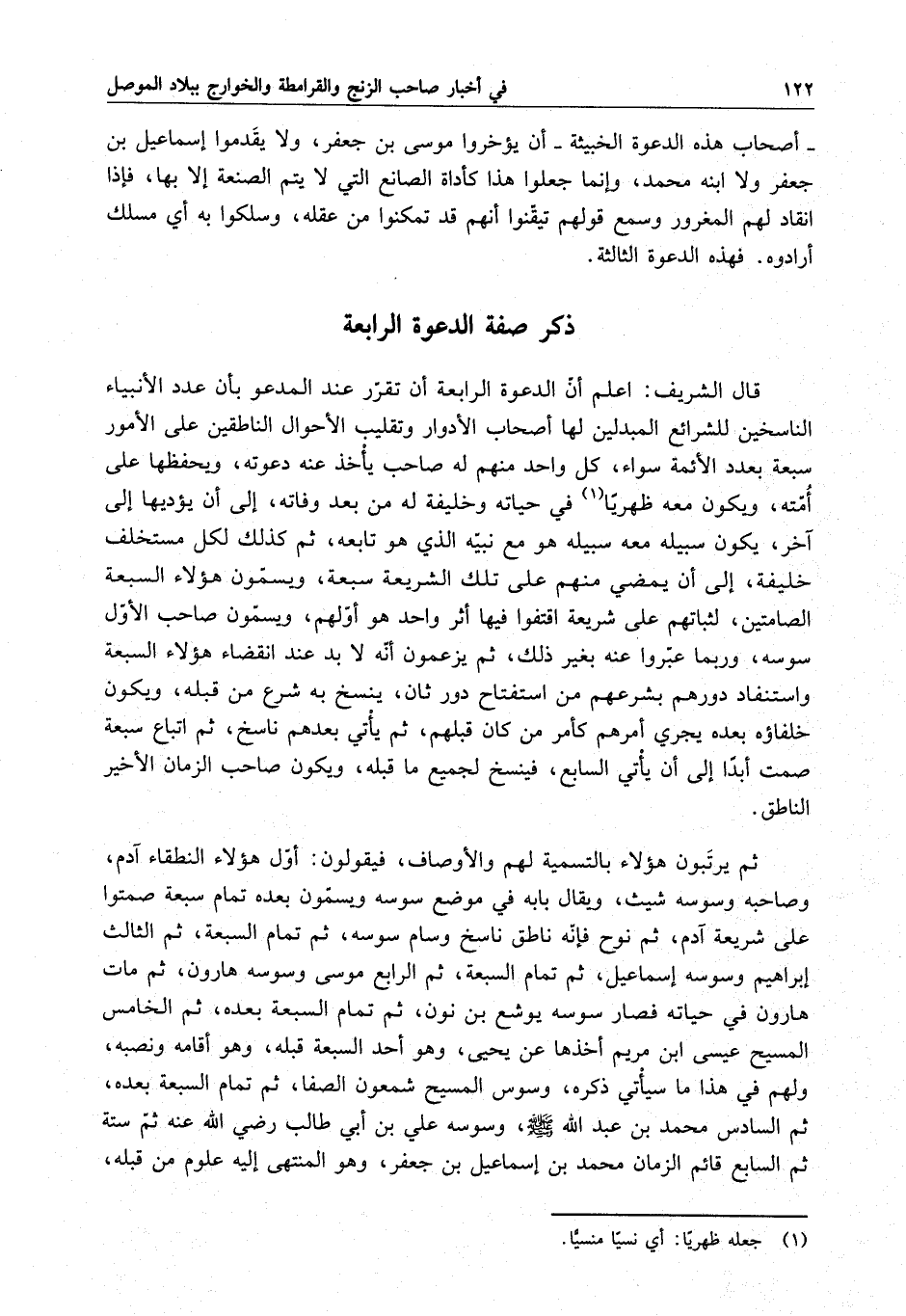 قال الشريف : أعلم أن الدعوة الرابعة أن تقرر المدعو بأن عدد الأنبياء الناسخين للشرائع المبدلين لها أصحاب الأدوار وتقليب الأحوال الناطقين على الأمور سبعة بعدد الأئمة سواء ، كل واحد منهم له صاحب يأخذ عنه دعوته ويحفظها على أمته ، ويكون معه ظهرياً في حياته وخليفة له من بعد وفاته ، إلى أن يؤديها إلى آخر ، يكون سبيله معه سبيله هو مع نبيه الذي هو تابعه ، ثم كذلك لكل مستخلف خليفة ، إلى أن يمضي منهم على تلك الشريعة سبعة ، ويسمون هؤلاء السبعة الصامتين ، لثباتهم على شريعة اقتفوا فيها أثر واحد هو أولهم ، ويسمون صاحب الأول سوسه ، وربما عبروا عنه بغير ذلك : ثم يزعمون أنه عند انقضاء هؤلاء السبعة واستنفاذ دورهم بشرعهم من استفتاح دور ثان ، ينسخ به شرع من قبله ، ويكون خلفاؤه بعده يجري أمرهم كأمر من كان قبلهم ، ثم يأتي بعدهم ناسخ ، ثم اتباع سبعة صمت أبداً إلى أن يأتي السابع ، فينسخ لجميع ما قبله ، ويكون صاحب الزمان الأخير الناطق . ثم يرتبون هؤلاء بالتسمية لهم والأوصاف ، فيقولون : أول هؤلاء النطقاء آدم ، وصاحبه وسوسة شيث ، ويقال بابه في موضع سوسه ويسمون بعده تمام سبعة صمتوا على شريعة آدم ، ثم نوح فإنه ناطق ناسخ وسام سوسه ، ثم تمام السبعة ، ثم الثالث إبراهيم وسوسه إسماعيل ، ثم تمام السبعة ، ثم الرابع موسى وسوسه هارون ، ثم مات هارون في حياته فصار سوسه يوشع بن نون ثم تمام السبعة بعده ، ثم الخامس المسيح عيسى بن مريم أخذها عن يحيى ، وهو أحد السبعة قبله ، وهو أقامه ونصبه ، ولهم في هذا ما سيأتي ذكره ، وسوس المسيح شمعون الصفا ، ثم تمام السبعة بعده ، ثم السادس محمد بن عبد الله ( صلى الله عليه وسلم ) ، وسوسه علي بن أبي طالب رضي الله عنه ثم ستة ثم السابع قائم الزمان محمد بن إسماعيل بن جعفر ، وهو المنتهى إليه علوم من قبله ،