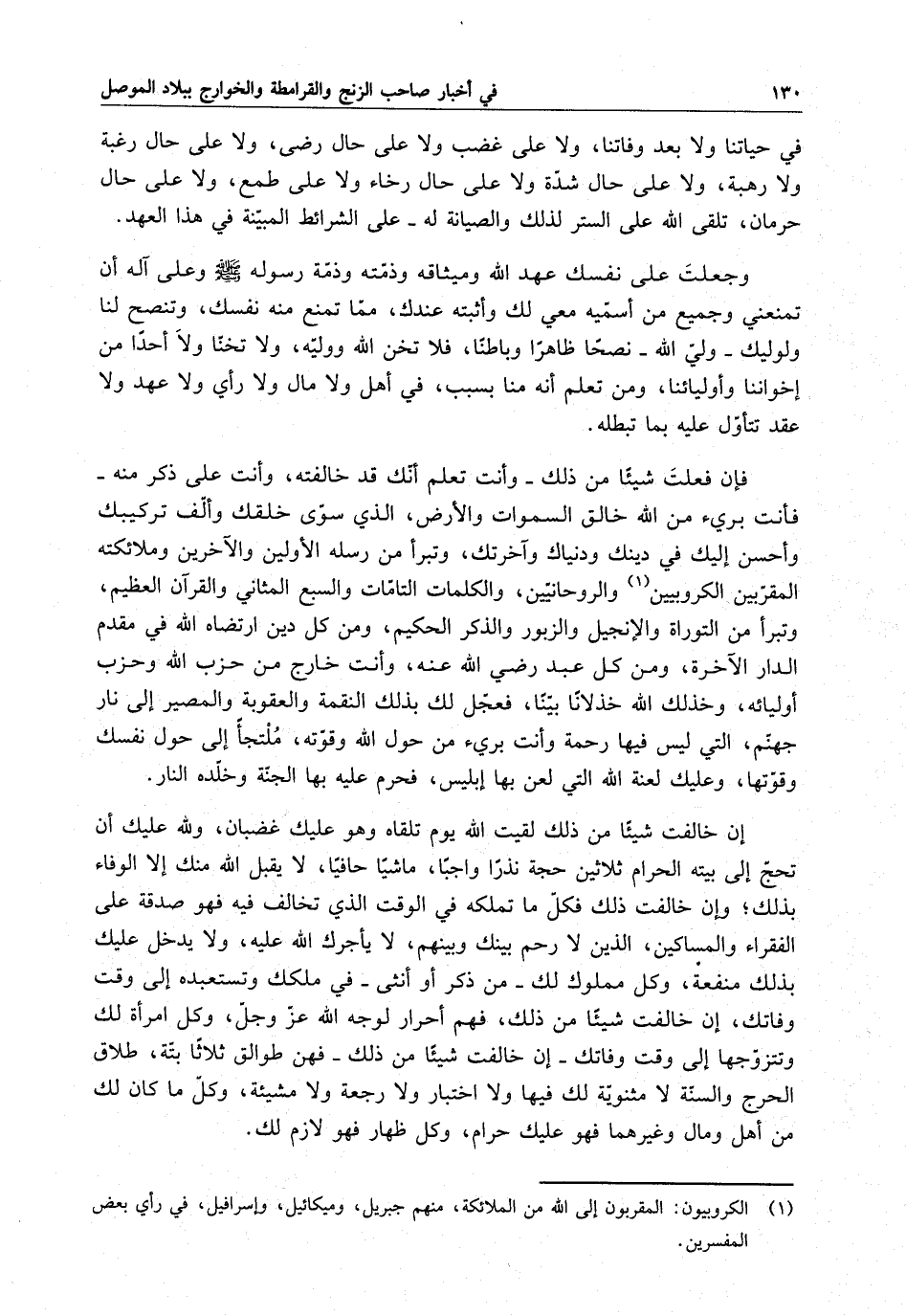 فإن فعلت شيئاً من ذلك - وأنت تعلم أنك قد خالفته ، وأنت على ذكر منه - فأنت برى من الله خالق السموات والأرض ، الذي سوى خلقك وألف تركيبك وأحسن إليك في دينك ودنياك وآخرتك ، وتبرأً من رسله الأولين والآخرين وملائكته المقربين الكروبين والروحانيين ، والكلمات التامات والسبع المثاني والقرآن العظيم ، وتبرأ من التوراة والإنجيل والزبور والذكر الحكيم ، ومن كل دين ارتضاه الله في مقدم الدار الآخرة ، ومن كل عبد رضي الله عنه ، وأنت خارج من حزب الله وحزب أوليائه ، وخذلك الله خذلاناً بيناً ، فعجل لك بذلك النقمة والعقوبة والمصير إلى نار جهنم ، التي ليس فيها رحمة وأنت برئ من حول الله وقوته ، ملتجأ إلى حول نفسك وقوتها ، وعليك لعنة الله التي لعن بها إبليس ، فحرم عليه بها الجنة وخلده النار .