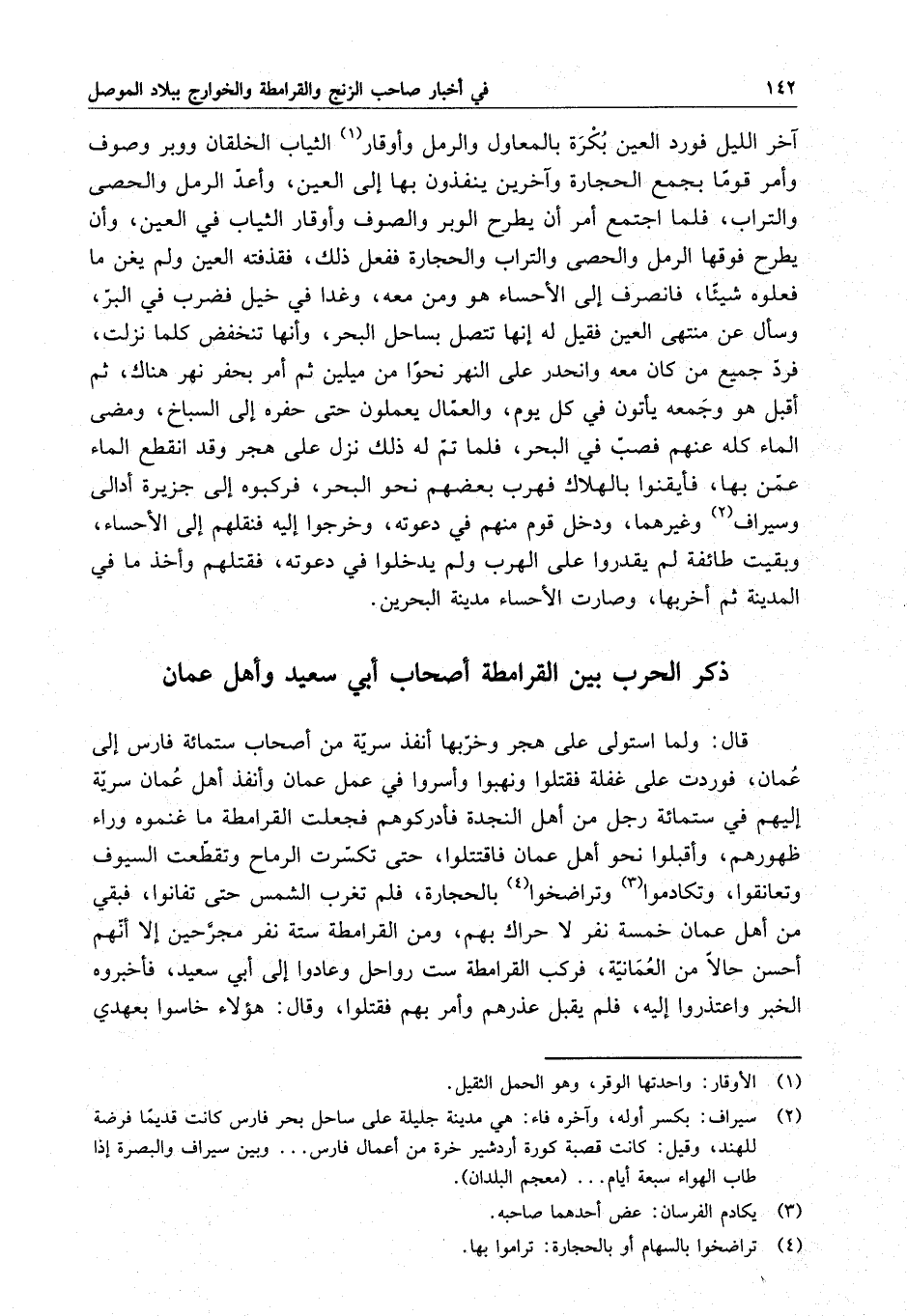 قال : ولما استولى على هجر وخربها أنفذ سرية من أصحابه ستمائة فارس إلى عمان ، فوردت على غفلة فقتلوا ونهبوا وأسروا في عمل عمان وأنفذ أهل عمان سرية إليهم في ستمائة رجل من أهل النجدة فأدركوهم فجعلت القرامطة ما غنموه وراء ظهورهم ، وأقبلوا نحو أهل عمان فاقتتلوا ، حتى تكسرت الرماح وتقطعت السيوف وتعانقوا ، وتكادموا وتراضخوا بالحجارة ، فلم تغرب الشمس حتى تفانوا ، فبقي من أهل عمان خمسة نفر لا حراك بهم ، ومن القرامطة ستة نفر مجرحين إلا أنهم أحسن حالاً من العمانية ، فركب القرامطة ست رواحل وعادوا إلى أبي سعيد ، فأخبروه الخبر واعتذروا إليه ، فلم يقبل عذرهم وأمر بهم فقتلوا ، وقال : هؤلاء خاسوا بعهدي