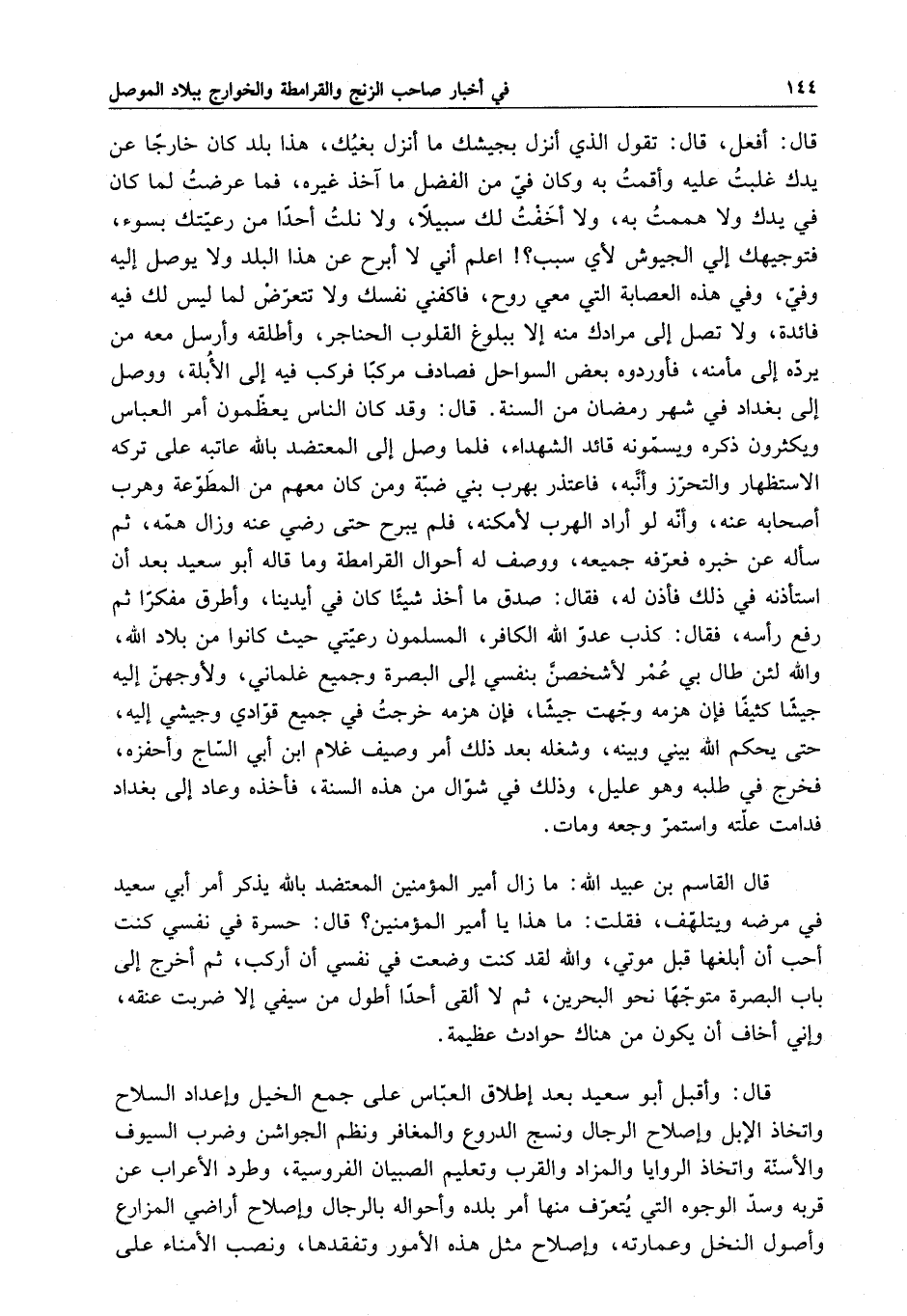 قال : أفعل ، قال : تقول الذي أنزل بجيشك ما أنزل بغتك ، هذا بلد كان خارجاً عن بلدك غلبت عليه وأقمت به وكان في من الفضل ما آخذ غيره ، فما عرضت لما كان في يدك ولا هممت به ، ولا أخفت لك سبيلاً ، ولا نلت أحداً من رعيتك بسوء ، فتوجيهك إلى الجيوش لأي سبب ؟ اعلم إني لا أبرح عن هذا البلد ولا يوصل إليه وفي ، وفي هذه العصابة التي معي روح ، فاكفني نفسك ولا تتعرض لما ليس لك فيه فائدة ، ولا تصل إلى مرادك منه إلا ببلوغ القلوب الحناجر ، وأطلقه وأرسل معه من يرده إلى مأمنه ، فأوردوه بعض السواحل فصادف مركباً فركب فيه إلى الأباة ، ووصل إلى بغداد في شهر رمضان من السنة . قال : وقد كان الناس يعظمون أمر العباس ويكثرون ذكره ويسمونه قائد الشهداء ، فلما وصل إلى المعتضد بالله عاتبه على تركه الاستظهار والتحرز وأنبه ، فاعتذر بهرب بني ضبة ومن كان معهم من المطوعة وهرب أصحابه عنه ، وأنه لو أراد الهرب لأمكنه ، فلم يبرح حتى رضي عنه وزال همه ، ثم سأله عن خبره فعرفه جميعه ، ووصف له أحوال القرامطة وما قاله أبو سعيد بعد أن استأذنه في ذلك فأذن له ، فقال : صدق ما أخذ شيئاً كان في أيدينا ، وأطرق مفكراً ثم رفع رأسه ، فقال : كذب عدو الله الكافر ، المسلمون رعيتي حيث كانوا من بلاد الله ، والله لئن طال بي عمر لأشخصن بنفسي إلى البصرة وجميع غلماني ، ولأوجهن إليه جيشاً كثيفاً فإن هزمه وجهت جيشاً ، فإن هزمه خرجت في جميع قوادي وجيشي إليه ، حتى يحكم الله بيني وبينه ، وشغله بعد ذلك أمر وصيف غلام ابن أبي الساج وأحفزه ، فخرج في طلبه وهو عليل ، وذلك في شوال من هذه السنة ، فأخذه وعاد إلى بغداد فدامت علته واستمر وجعه ومات .