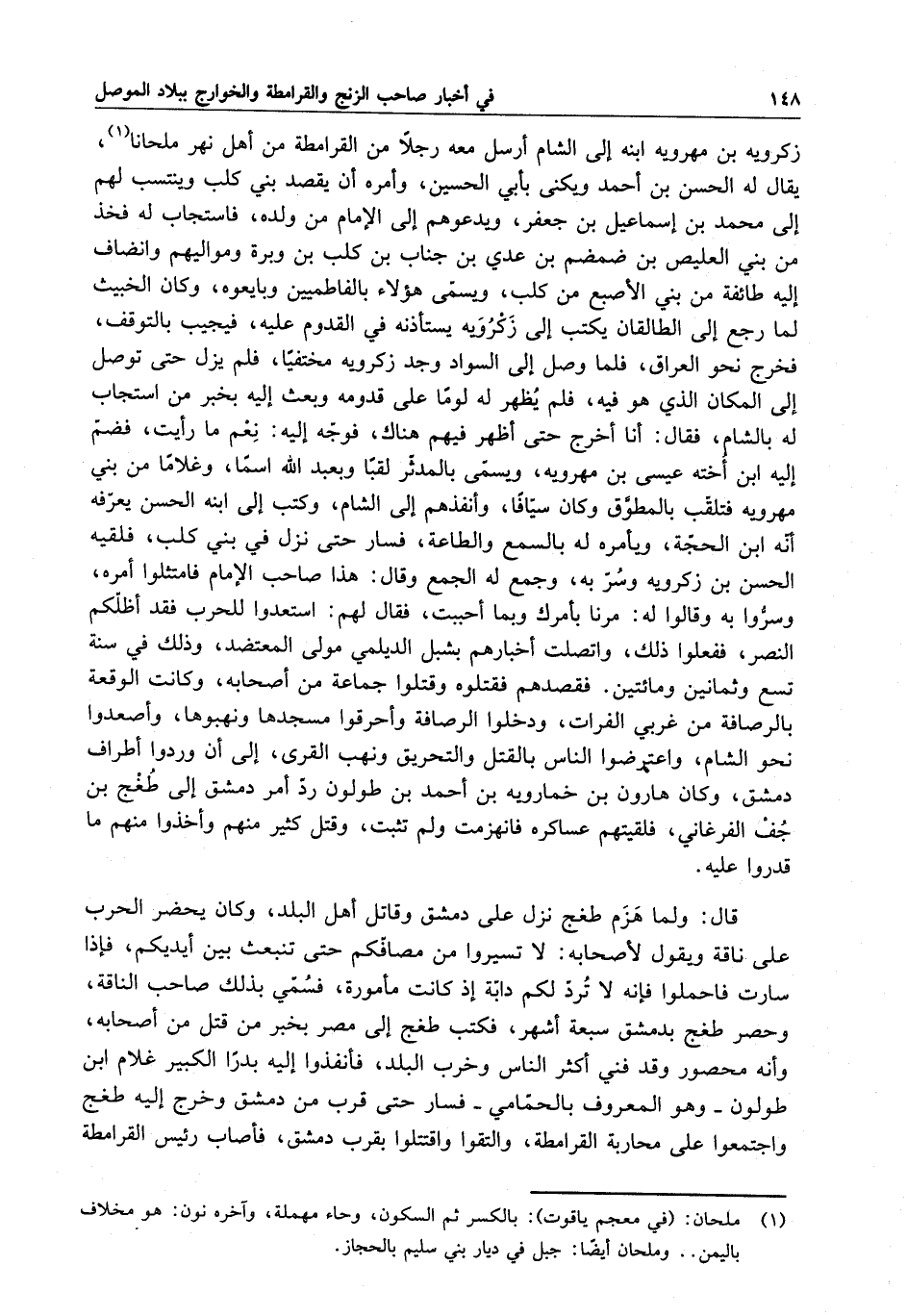 قال : ولما هزم طغج نزل على دمشق وقاتل أهل البلد ، وكان يحضر الحرب على ناقة ويقول لأصحابه : لا تسيروا من مصافكم حتى تنبعث بين أيديكم ، فإذا سارت فاحملوا فإنه لا ترد لكم دابة إذ كانت مأمورة ، فسمى بذلك صاحب الناقة ، وحصر طغج بدمشق سبعة أشهر ، فكتب إلى طغج إلى مصر بخبر من قتل من أصحابه ، وأنه محصور وقد فني أكثر الناس وخرب البلد ، فأنفذوا إليه بدراً الكبير غلام ابن طولون - وهو المعروف بالحمامي - فسار حتى قرب من دمشق وخرج إليه طغج واجتمعوا على محاربة القرامطة ، والتقوا واقتتلوا بقرب دمشق ، فأصاب رئيس القرامطة