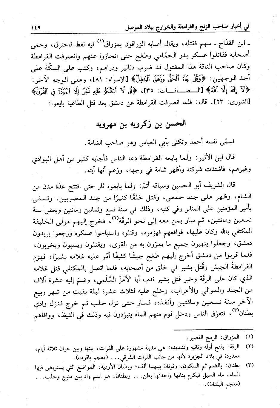 - ابن القداح - سهم فقتله ، ويقال أصابه الزراقون بمزراق فيه نفط فاحترق ، وحمى أصحابه فقاتلوا عسكر بدر الحمامي وطغج حتى انحازوا عنهم وانصرفت القرامطة وكان صاب الناقة هذا المقتول قد ضرب دنانير ودراهم ، وكتب على السكة على أحد الوجهين : قل جاء الحق وزهق الباطل ، وعلى الوجه الآخر : لا إله إلا الله ، قل لا أسألكم عليه أجراً إلا المودة في القربى . قال : فلما انصرفت القرامطة عن دمشق بعد قتل الطاغية بايعوا :