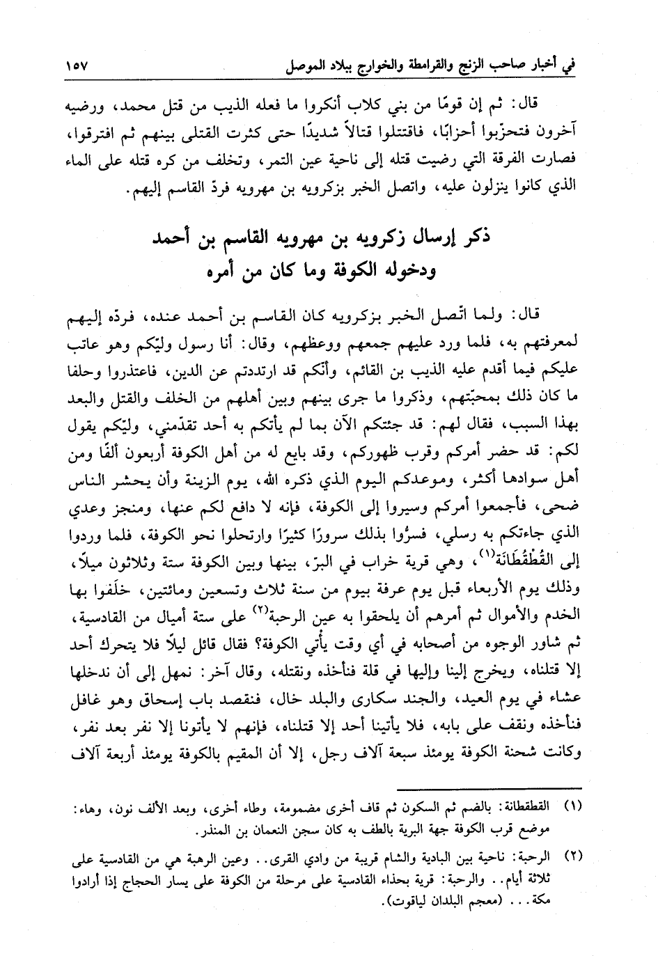 قال : ولما اتصل الخبر بزكرويه كان القاسم بن أحمد عنده ، فرده إليهم لمعرفتهم به ، ورد عليهم جمعهم ووعظهم ، وقال : أنا رسول وليكم وهو غائب عليكم فيما أقدم عليه الذيب بن القائم ، وأنكم قد ارتدتم عن الدين ، فاعتذروا وحلفوا ما كان ذلك بمحبتهم ، وذكروا ما جرى بينهم وبين أهلهم من الخلف والقتل والبعد بهذا السبب ، فقال لهم : قد جئتكم الآن بما لم يأتكم به أحد تقدمني ، وليكم يقول لكم : قد حضر أمركم وقرب ظهوركم ، وقد بايع له من أهل الكوفة أربعون ألفا ومن أهل سوداها أكثر ، وموعدكم اليوم الذي ذكره الله ، يوم الزينة وأن يحشر الناس ضحى ، فأجمعوا أمركم وسيرو إلى الكوفة ، فإنه لا دافع لكم عنها ، ومنجز وعدي الذي جاءتكم به رسلي ، قسروا بذلك سروراً كثيراً وارتحلوا نحو الكوفة ، فلما وردوا إلى القطقطانة ، وهي قرية خراب في البر ، بينها وبين الكوفة ستة وثلاثون ميلاً ، وذلك يوم الأربعاء قبل يوم عرفة بيوم من سنة ثلاث وتسعين ومائتين ، خلفوا بها الخدم والأموال أمرهم أن يلحقوا به عن الرحبة ستة أميال لها ألف وسيلة ثم شاور الوجوه من أصحابه في أي وقت يأتي الكوفة ؟ فقال قائل ليلاً فلا يتحرك أحد إلا قتلناه ، ويخرج إلينا وإليها في قلة فنأخذه ونقتله ، وقال آخر : نمهل أن ندخلها عشاء في يوم العيد ، والجند سكارى والبلد خال ، فنقصد باب إسحاق وهو غافل فنأخذه ونقف على بابه ، فلا يأتينا أحد إلا قتلناه ، فإنهم لا يأتونا إلا نفر بعد نفر ، وكانت شحنة الكوفة يومئذ سبعة آلاف رجل ، إلا أن المقيم بالكوفة يومئذ أربعة آلاف