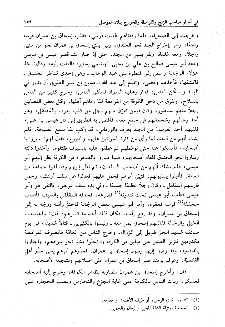 وخرجت إلى الصحراء ، فلما رددناهم طعنت فرسي ، فقلب إسحاق بن عمران فرسه راجعاً ، وأمر بإخراج الجند نحو الخندق ، وبين يدي إسحاق بن عمران نحو من ستين راجلاً ، ومعه غلمانه ونفر يسير من الجند ، حتى صار عند قصر عيسى بن موسى ومعه أبو عيسى صالح بن علي بن يحيى الهاشمي يسايره فالتفت إليه ، وقال : خذ هؤلاء الرجالة وامض إلى قنطرة بني عبد الوهاب - وهي إحدى قناطر الخندق - فاكشفها ، فأخذهم ومضى ، وتقدم إلى عبد الله الحسين بن عمر العلوي أن يدور في البلد ويسكن الناس ، فدار وعليه السواد فسكن الناس ، وخرج كثير من الناس بالسلاح ، وتفرق من دخل الكوفة من القرامطة لما رماهم أهلها ، وقتل بعض القصابين رجلاً منهم بساطور ، وكان فيمن تفرق منهم رجل من كلب يعرف بالمقلقل ، وهو أحد رجالهم وشجعانهم في جمع معه ، فأفضى به الطريق إلى دار عيسى بن علي ، فلقيهم أحد الفرسان من الجند يعرف بالورداني ، قد ركب لما سمع الصيحة ، فلم يشك أنهم من الجند لما رأى من كثرة الجواشن عليهم والدروع ، فقال لهم : سيروا يا أصحابنا ، فأمسكوا عنه حتى توسطهم ثم عطفوا عليه بالسيوف فقتلوه ، وأخذوا دابته وساروا نحو الخندق للقاء أصحابهم ، فلما صاروا بالصحراء من الكوفة نظر إليهم أبو عيسى ، فلم يشك أنهم من أصحاب السلطان ، ثم نظر إليهم وقد لقوا جماعة من العامة ، فأقبلوا يسبلونهم ، فتبين أمرهم فحمل عليهم فعدلوا عن سلب أولئك ، وحمل فارسهم المقلقل - وكان رجلاً عظيماً جسيماً - وفي يده سيف عريض ، فالتقى هو وأبو عيسى فطعنه أبو عيسى تحت ثندوته فصرعه ، فحذفه المقلقل بالسيف فأصاب جحفله فرسه فعقره ، وأمر أبو عيسى بعض الرجالة فاختز رأسه ووجه به إلى إسحاق بن عمران ، وقد رفع رأسه ، فكان ذلك أحد ما كسرهم ؛ قال : واجتمعت الخيل والرجالة فقاتلهم إسحاق بمن معه - وليسوا بالكثيرين - قتالاً شديداً ، في يوم صائف شديد الحر طويل إلى الزوال ، وخرج الناس من العامة فانصرف القرامطة مكدودين فنزلوا العدير على ميلين من الكوفة وارتحلوا عشياً نحو سوادهم ، واجتازوا بالقادسية ، وقد وصل إليهم رسول إسحاق بن عمران ، فحذرهم أمرهم يعني حذر أهل القادسية ، وعرف يومئذ صبر إسحاق ابن عمران على حملاتهم وتشجيعه لأصحابه . أن يدور في البلد ويسكن الناس ، فدار وعليه السواد فسكن الناس ، وخرج كثير من الناس بالسلاح ، وتفرق من دخل الكوفة من القرامطة لما رماهم أهلها ، وقتل بعض القصابين رجلاً منهم بساطور ، وكان فيمن تفرق منهم رجل من كلب يعرف بالمقلقل ، وهو أحد رجالهم وشجعانهم في جمع معه ، فأفضى به الطريق إلى دار عيسى بن علي ، فلقيهم أحد الفرسان من الجند يعرف بالورداني ، قد ركب لما سمع الصيحة ، فلم يشك أنهم من الجند لما رأى من كثرة الجواشن عليهم والدروع ، فقال لهم : سيروا يا أصحابنا ، فأمسكوا عنه حتى توسطهم ثم عطفوا عليه بالسيوف فقتلوه ، وأخذوا دابته وساروا نحو الخندق للقاء أصحابهم ، فلما صاروا بالصحراء من الكوفة نظر إليهم أبو عيسى ، فلم يشك أنهم من أصحاب السلطان ، ثم نظر إليهم وقد لقوا جماعة من العامة ، فأقبلوا يسبلونهم ، فتبين أمرهم فحمل عليهم فعدلوا عن سلب أولئك ، وحمل فارسهم المقلقل - وكان رجلاً عظيماً جسيماً - وفي يده سيف عريض ، فالتقى هو وأبو عيسى فطعنه أبو عيسى تحت ثندوته فصرعه ، فحذفه المقلقل بالسيف فأصاب جحفله فرسه فعقره ، وأمر أبو عيسى بعض الرجالة فاختز رأسه ووجه به إلى إسحاق بن عمران ، وقد رفع رأسه ، فكان ذلك أحد ما كسرهم ؛ قال : واجتمعت الخيل والرجالة فقاتلهم إسحاق بمن معه - وليسوا بالكثيرين - قتالاً شديداً ، في يوم صائف شديد الحر طويل إلى الزوال ، وخرج الناس من العامة فانصرف القرامطة مكدودين فنزلوا العدير على ميلين من الكوفة وارتحلوا عشياً نحو سوادهم ، واجتازوا بالقادسية ، وقد وصل إليهم رسول إسحاق بن عمران ، فحذرهم أمرهم يعني حذر أهل القادسية ، وعرف يومئذ صبر إسحاق ابن عمران على حملاتهم وتشجيعه لأصحابه .