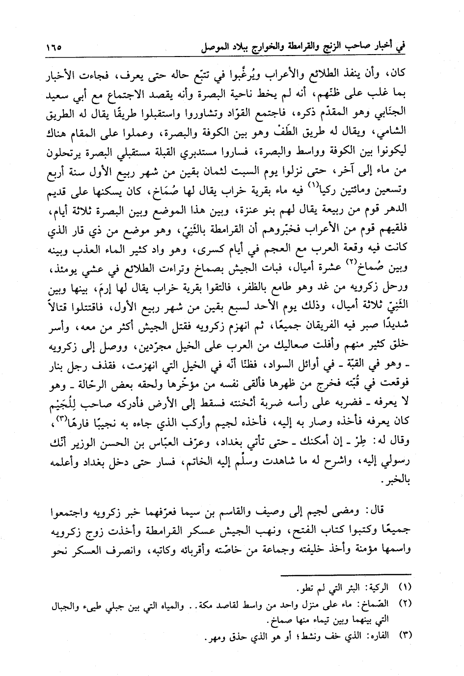 كان ، وأن ينفذ الطلائع والأعراب ويرغبوا في تتبع حاله حتى يعرف ، فجاءت الأخبار بما غلب على ظنهم ، أنه لم يخط ناحية البصرة وأنه يقصد الاجتماع مع أبي سعيد الجنابي وهو المقدم ذكره ، فاجتمع القواد وتشاوروا واستقبلوا طريقاً يقال له الطريق الشامي ، ويقال له طريق الطف وهو بين الكوفة والبصرة ، وعملوا على المقام هناك ليكونوا بين الكوفة وواسط والبصرة ، فساروا مستدبري القبلة مستقبلي البصرة يرتجلون من ماء إلى آخر ، حتى نزلوا يوم السبت لثمان بقين من شهر ربيع الأول سنة أربع وتسعين ومائتين ركباً فيه ماء بقرية خراب يقال لها صماخ ، كان يسكنها على قديم الدهر قوم من ربيعة يقال لهم بنو عنزة ، وبين هذا الموضع وبين البصرة ثلاثة أيام ، فلقيهم قوم من الأعراب فخبروهم أن القرامطة بالثنى ، وهو موضع من ذي قار الذي كانت فيه وقعة العرب مع العجم في أيام كسرى ، وهو واد كثير الماء العذب وبينه وبين صماغ عشرة أميال ، فبات الجيش بصماغ وتراءت الطلائع في عشي يومئذ ، ورحل زكرويه من غد وهو طامع بالظفر ، فالتقوا بقرية خراب يقال لها إرم ، بينها وبين الثنى ثلاثة أميال ، وذلك يوم الأحد لسبع بقين من شهر ربيع الأول ، فاقتتلوا قتالاً شديداً صبر فيه الفريقان جميعاً ، ثم انهزم كروية فقتل الجيش أكثر من معه ، وأسر خلق كثير منهم وأفلت صعاليك من العرب على الخيل مجردين ، ووصل إلى زكروية - وهو في القبة - في أوائل السواد ، فظنوا أنه في الخيل التي انهزمت ، فقذف رجل بنار فوقعت في قبته فخرج من ظهرها فألقى نفسه من مؤخرها ، ولحقه بعض الرجالة - وهو لا يعرفه - فضربه على رأسه ضربة أثخنته فسقط إلى الأرض فأدركه صاحب للجيم كله يعرفه فأخذه وصار به إليه ، فأخذه لجيم وأركب الذي جاءه به نجيباً فارهاً ، وقال له : طر - إن أمكنك - حتى تأتي بغداد ، وعرف العباس بن الحسن الوزير أنك رسولي إليه ، واشرح له ما شاهدت وسلم إليه الخاتم ، فسار حتى دخل بغداد وأعلمه بالخبر .