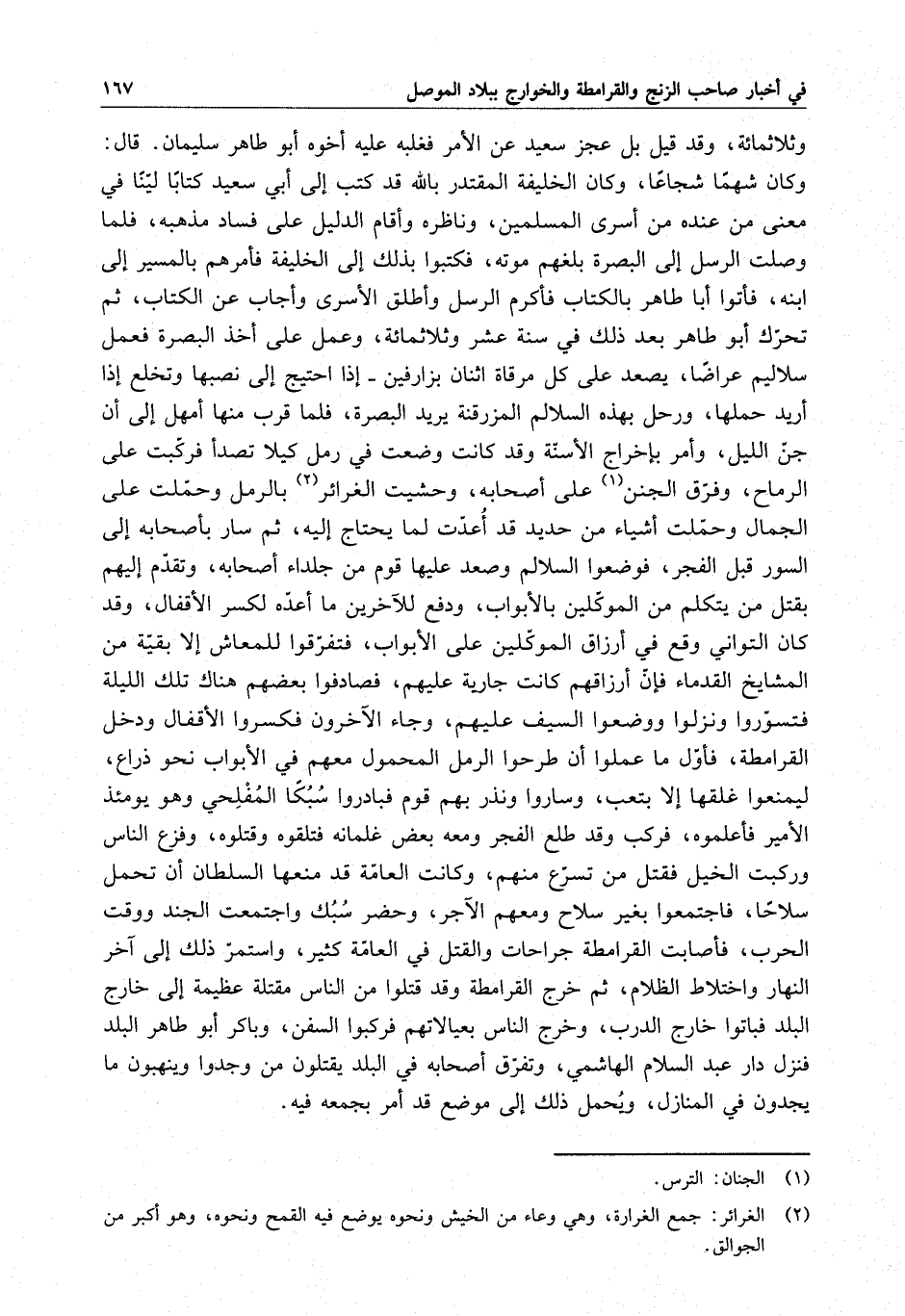 وثلاثمائة ، وقد قيل بل عجز سعيد عن الأمر فغلبه عليه أخوه أبو طاهر سليمان . قال : وكان شهماً شجاعاً ، وكان الخليفة المقتدر بالله قد كتب إلى أبي سعيد كتابا لينا في معنى من عنده من أسرى المسلمين ، وناظره وأقام الدليل على فساد مذهبه ، فلما وصلت الرسل إلى البصرة بلغهم موته ، فكتبوا بذلك إلى الخليفة فأمرهم بالمسير إلى ابنه ، فأتوا أبا طاهر بالكتاب فأكرم الرسل وأطلق الأسرى وأجاب عن الكتاب ، ثم تحرك أبو طاهر بعد ذلك في سنة عشر وثلاثمائة ، وعمل على أخذ البصرة فعمل سلاليم عراضاً ، يصعد على كل مرقاة اثنان بزرافين - إذا احتيج إلى نصبها وتخلع إذا أريد حملها ، ورحل بهذه السلالم المزرقنة يريد البصرة فلما قرب منها أمهل إلى أن جن الليل ، وأمر بإخراج الأسنة وقد كانت وضعت في رمل كيلا تصدأ فركبت على الرماح ، وفرق الجنن على أصحابه ، وحشيت الغرائز بالرمل وحملت على الجمال وحملت أشياء من حديد قد أعدت لما يحتاج إليه ، ثم سار بأصحابه إلى السور قبل الفجر ، فوضعوا السلالم وصعد عليها قوم من جلداء أصحابه ، وتقدم إليهم من يتكلم من الموكلين بالأبواب ، ودفع للآخرين ما أعده لكسر الأقفال ، وقد كان التواني وقع في أرزاق الموكلين على الأبواب ، فتفرقوا للمعاش إلا بقية من المشايخ القدماء فإن أرزاقهم كانت جارية عليهم ، فصادفوا بعضهم هناك تلك الليلة فتسوروا ونزلوا ووضعوا السيف عليهم ، وجاء الآخرون فكسروا الأقفال ودخل القرامطة ، فأول ما عملوا أن طرحوا الرمل المحمول معهم في الأبواب نحو ذراع ، ليمنعوا غلقها إلا بتعب ، وساروا ونذل بهم قوم فبادروا سبكاً المفلحي وهو يومئذ الأمير فأعلموه ، فركب وقد طلع الفجر ومعه بعض غلمانه فتلقوه وقتلوه ، وفزع الناس وركبت الخيل فقتل من تسرع منهم ، وكانت العامة قد منعها السلطان أن تحمل سلاحاً ، فاجتمعوا بغير سلاح ومعهم الآجر ، وحضر سبك واجتمعت الجند ووقعت الحرب ، فأصابت القرامطة جراحات والقتل في العامة كثير ، واستمر ذلك إلى آخر النهار واختلاط الظلام ، ثم خرج القرامطة وقد قتلوا من الناس مقتلة عظيمة إلى خارج البلد فباتوا خارج الدرب ، وخرج الناس بعيالاتهم فركبوا السفن ، وباكر أبو طاهر البلد فنزل دار عبد السلام الهاشمي ، وتفرق أصحابه في البلد يقتلون من وجدوا وينهبون ما يجدون في المنازل ، ويحمل ذلك إلى موضع قد أمر بجمعه فيه .
