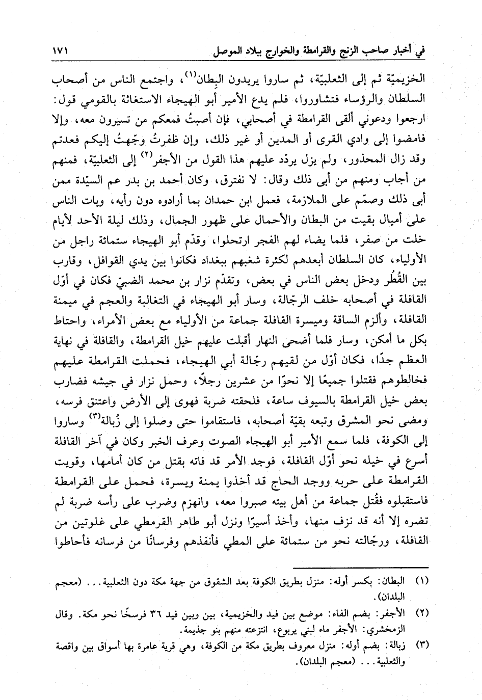 الخزيمية ثم إلى الثعلبية ، ثم ساروا يريدون البطان ، واجتمع الناس من أصحاب السلطان والرؤساء فتشاوروا ، فلم يدع الأمير أبو الهيجاء الاستعاثة بالقوم يقول : ارجعوا ودعوني ألقي القرامطة في أصحابي ، فإن أصبت فمعكم من تسيرون معه ، وإلا فامضوا إلى وادي القرى أو المدينة أو غير ذلك ، وإن ظفرت وجهت إليكم فعدتم وقد زال المحذور ، ولم يزل يردد عليهم هذا القول من الأجفر إلى الثعلبية ، فمنهم من أجاب ومنهم من أبى ذلك وقال : لا نفترق ، وكان أحمد بن بدر عم السيدة ممن أبى ذلك وصمم على الملازمة ، فعمل ابن حمدان بما أرادوه دون رأيه ، وبات الناس على أميال بقيت من البطان والأحمال على ظهور الجمال ، وذلك ليلة الأحد لأيام خلت من صفر ، فلما أضاء لهم الفجر ارتحلوا ، وقدم أبو الهيجاء ستمائة راجل من الأولياء ، كان السلطان أبعدهم لكثرة شغبهم ببغداد فكانوا بين يدي القوافل ، وقارب بين القطر ودخل بعض الناس في بعض ، وتقدم نزار بن محمد الضبي فكان في أول القافلة في أصحابه خلف الرجالة ، وسار أبو الهيجاء في التغالبة والعجم في ميمنة القافلة ، وألزم الساقة وميسرة القافلة جماعة من الأولياء مع بعض الأمراء ، واحتاط بكل ما أمكن ، وسار فلما أضحى النهار أقبلت عليهم خيل القرامطة ، والقافلة في نهاية العظم جداً ، فكان أول من لقيهم رجالة أبي الهيجاء ، فحملت القرامطة عليهم فخالطوهم فقتلوا جميعاً إلا نحواً من عشرين رجلاً ، وحمل نزار في جيشه فضارب بعض خيل القرامطة بالسيوف ساعة ، فلحقته ضربة فهوى إلى الأرض واعتنق فرسه ، ومضى نحو المشرق وتبعه بقية أصحابه ، فاستقاموا حتى وصلوا إلى زبالة وساروا إلى الكوفة ، فلما سمع الأمير أبو الهيجاء الصوت وعرف الخبر وكان في آخر القافلة أسرع في خيله نحو أول القافلة ، فوجد الأمر قد فاته بقتل من كان أمامها ، وقويت القرامطة على حربه ووجد الحاج قد أخذوا يمنة ويسرة ، فحمل على القرامطة فاستقبلوه فقتل جماعة من أهل بيته صبروا معه ، وانهزم وضرب على رأسه ضربة لم تضره إلا أنه قد نزف منها ، وأخذ أسيراً ونزل أبو طاهر القرمطي على غلوتين من القافلة ، ورجالته نحو من ستمائة على المطى فأنفذهم وفرساناً من فرسانه فأحاطوا