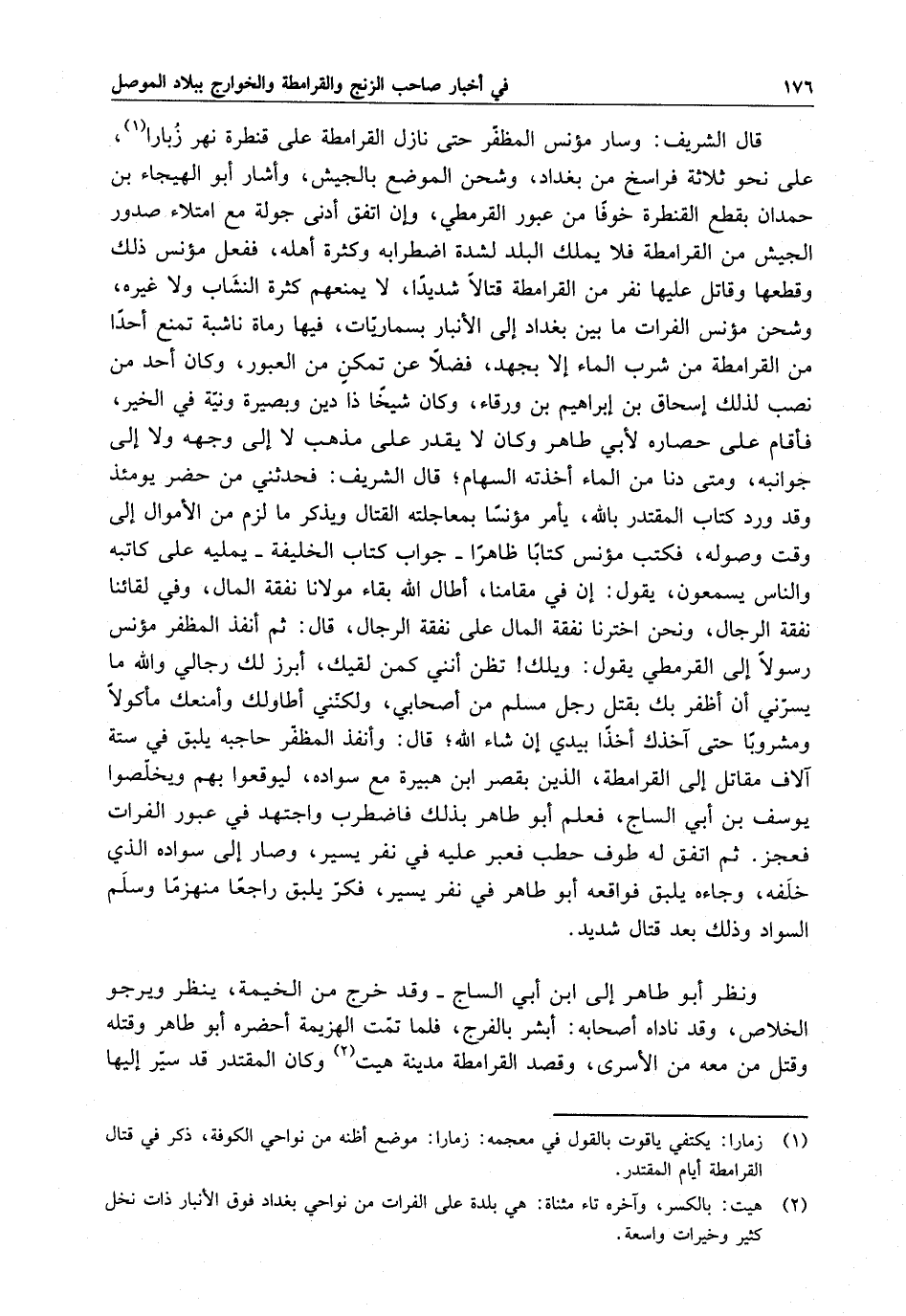 قال الشريف : وسار مؤنس المظفر حتى نازل القرامطة على قنطرة نهر زبارا ، على نحو ثلاثة فراسخ من بغداد ، وشحن الموضع بالجيش ، وأشار أبو الهيجاء بن حمدان بقطع القنطرة خوفاً من عبور القرمطي ، وإن اتفق أدنى جولة مع امتلاء صدور الجيش من القرامطة فلا يملك البلد لشدة اضطرابه وكثرة أهله ، ففعل مؤنس ذلك وقطعها وقاتل عليها نفر من القرامطة قتالاً شديداً ، لا يمنعهم كثرة النشاب ولا غيره ، وشحن مؤنس الفرات ما بين بغداد إلى الأنبار بسماريات ، فيها رماة ناشبة تمنع أحداً من القرامطة من شرب الماء إلا بجهد ، فضلاً عن تمكن من العبور ، وكان أحد من نصب لذلك إسحاق بن إبراهيم بن ورقاء ، وكان شيخاً ذا دين وبصيرة ونية في الخير ، فأقام على حصاره لأبي طاهر وكان لا يقدر على مذهب لا إلى وجهه ولا إلى جوانبه ، ومتى دنا من الماء أخذته السهام ؛ قال الشريف : فحدثني من حصر يومئذ وقد ورد كتاب المقتدر بالله ، يأمر مؤنساً بمعاجلته القتال ويذكر ما لزم من الأموال إلى وقت وصوله ، فكتب مؤنس كتاباً ظاهراً - جواب كتاب الخليفة - يمليه على كاتبه والناس يسمعون ، يقول : إن في مقامنا ، أطال الله بقاء مولانا نفقة المال ، وفي لقائنا نفقة الرجال ، ونحن اخترنا نفقة المال على نفقة الرجال ، قال : ثم أنفذ المظفر مؤنس رسولاً إلى القرمطي يقول : ويلك تظن أنني كمن لقيك ، أبرز لك رجالي والله ما يسرني أن أظفر بقتل بك رجل مسلم من أصحابي ، ولكنني أطاولك وأمنعك مأكولاً ومشروباً حتى آخذك أخذا بيدي إن شاء الله ؛ قال : وأنفذ المظفر حاجيه يلبق في ستة آلاف مقاتل إلى القرامطة ، الذين بقصر ابن هبيرة مع سواده ، ليوقعوا بهم ويخلصوا يوسف بن أبي الساج ، فعلم أبو طاهر بذلك فاضطرب واجتهد في عبور الفرات فعجز . ثم اتفق له طوف حطب فعبر عليه في نفر يسير ، وصار إلى سواده الذي خلفه ، وجاءه يلبق فواقعه أبو طاهر في نفر يسير ، فكر يلبق راجعاً منهزماً وسلم السواد وذلك بعد قتال شديد .