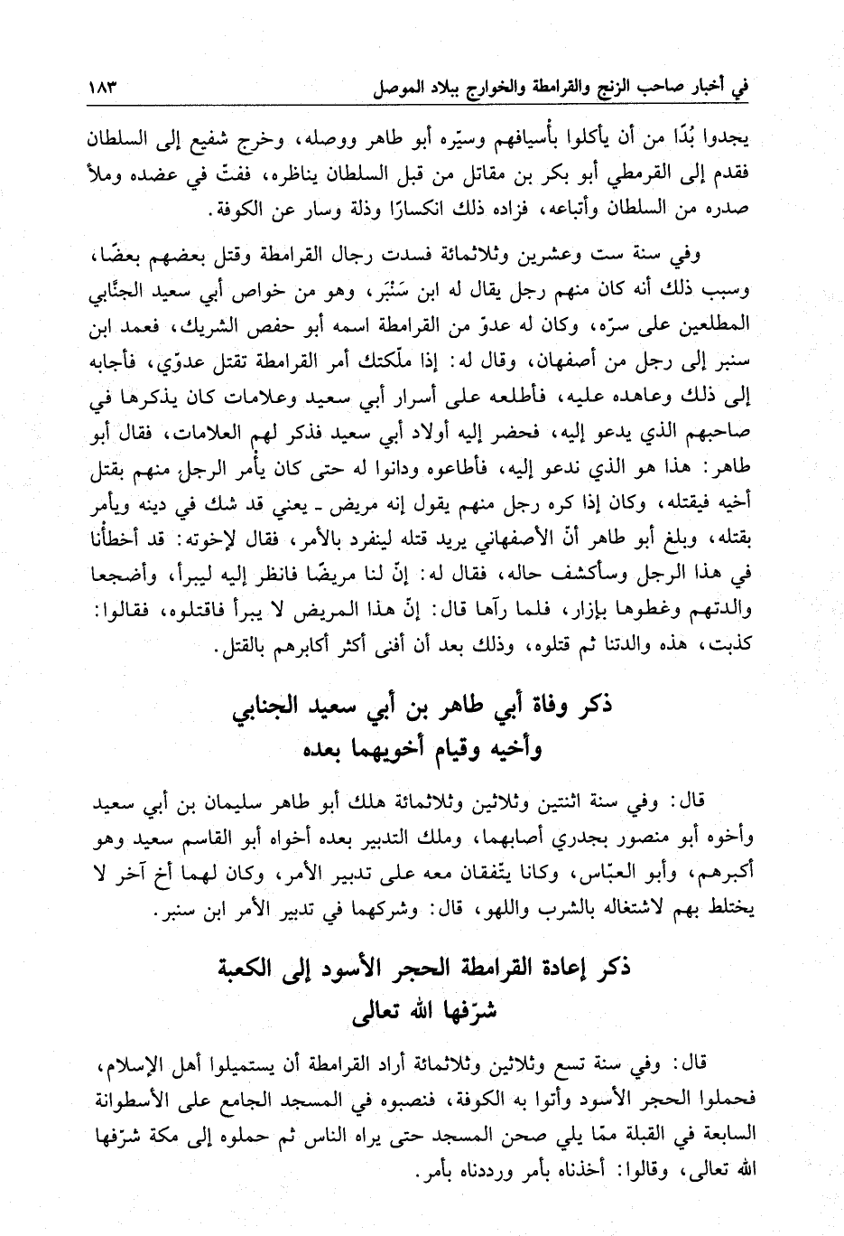 يجدوا بدا من أن يأكلوا بأسيافهم وسيره أبو طاهر ووصله ، وخرج شفيع إلى السلطان فقدم إلى القرمطي أبو بكر بن مقاتل من قبل السلطان يناظره ، ففت في عضده وملا صدره من السلطان وأتباعه ، فزاده ذلك انكساراً وذلة وسار عن الكوفة . وفي سنة ست وعشرين وثلاثمائة فسدت رجال القرامطة وقتل بعضهم بعضا ، وسبب ذلك أنه كان منهم رجل يقال له ابن سنبر ، وهو من خواص أبي سعيد الجنابي المطلعين على سره ، وكان له عدو من القرامطة اسمه أبو حفص الشريك ، فعمد ابن سنبر إلى رجل من أصفهان ، وقال له : إذا ملكتك أمر القرامطة نقتل عدوى ، فأجابه إلى ذلك وعاهده عليه ، فأطلعه على أسرار أبي سعيد وعلامات كان يذكرها في صاحبهم الذي يدعو إليه ، فحضر إليه أولاد أبي سعيد فذكر لهم العلامات ، فقال أبو طاهر : هذا هو الذي ندعو إليه ، فأطاعوه ودانوا له حتى كان يأمر الرجل منهم بقتل أخيه فيقتله ، وكان إذا كره رجل منهم يقول إنه مريض - يعني قد شك في دينه ويأمر بقتله ، وبلغ أبو طاهر أن الأصفهاني يريد قتله لينفرد بالأمر ، فقال لاخوته : قد أخطأنا في هذا الرجل وسأكشف حاله ، فقال له : إن لنا مريضاً فانظر إليه ليبرأ ، وأضجعوا والدتهم وغطوها بإزار ، فلما رآها قال : إن هذا المريض لا يبرأ فاقتلوه ، فقالوا : كذبت ، هذه والدتنا ثم قتلوه ، وذلك بعد أن أفنى أكثر أكابرهم بالقتل .