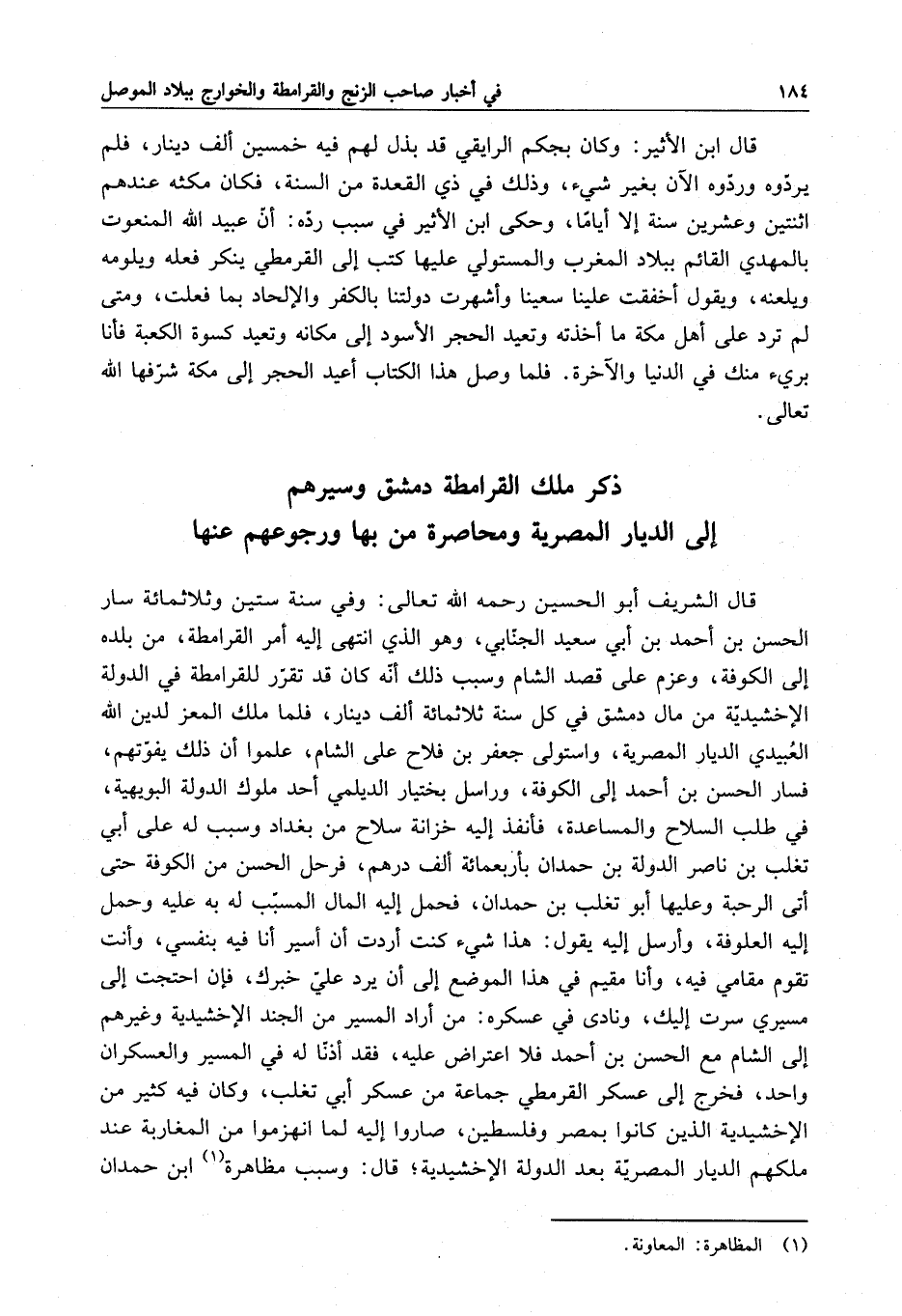 قال الشريف أبو الحسين رحمه الله تعالى : وفي سنة ستين وثلاثمائة سار الحسن بن أحمد بن أبي سعيد الجنابي ، وهو الذي انتهى إليه أمر القرامطة ، من بلده إلى الكوفة ، وعزم على قصد الشام وسبب ذلك أنه كان قد تقرر للقرامطة في الدولة الأخشيدية من مال دمشق في كل سنة ثلاثمائة ألف دينار ، فلما ملك المعز لدين الله العبيدي الديار المصرية ، واستولى جعفر بن فلاح على الشام ، علموا أن ذلك يفوتهم ، فسار الحسن بن أحمد إلى الكوفة ، وراسل بختيار الديلمي أحد ملوك الدولة البويهية ، في طلب السلاح والمساعدة ، فأنفذ إليه خزانة سلاح من بغداد وسبب له على أبي تغلب بن ناصر الدولة بن حمدان بأربعمائة ألف درهم ، فرحل الحسن من الكوفة حتى أتى الرحبة وعليها أبو تغلب بن حمدان ، فحمل إليه المال المسبب له به عليه وحمل إليه العلوفة ، وأرسل إليه يقول : هذا شيء كنت أردت أن أسير أنا فيه بنفسي ، وأنت تقوم مقامي فيه ، وأنا مقيم في هذا الموضع إلى أن يرد على خبرك ، فإن احتجت إلى مسيري سرت إليك ونادى في عسكره : من أراد المسير من الجند الإخشيدية وغيرهم إلى الشام مع الحسن بن أحمد فلا اعتراض عليه ، فقد أذنا له في المسير والعسكران واحد ، فخرج إلى عسكر القرمطي جماعة من عسكر أبي تغلب ، وكان فيه كثير من الإخشيدية الذين كانوا بمصر وفلسطين ، صاروا إليه لما انهزموا من المغاربة عند ملكهم الديار المصرية بعد الدولة الإخشيدية ؛ قال : وسبب مظاهرة ابن حمدان