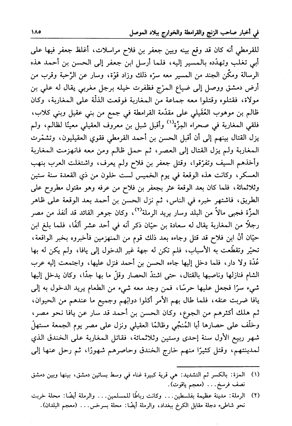 للقرمطي أنه كان قد وقع بينه وبين جعفر بن فلاح مراسلات ، أغلظ جعفر فيها على أبي تغلب وتهدده بالمسير إليه ، فلما أرسل ابن جعفر إلى الحسن ابن أحمد هذه الرسالة ومكن الجند من المسير معه سره ذلك وزاد قوة ، وسار عن الرحبة وقرب من أرض دمشق ووصل إلى ضياع المرج فظفرت خيله برجل مغربي يقال له علي بن مولاه ، فقتلوه وقتلوا معه جماعة من المغاربة فوقعت الذلة على المغاربة ، وكان ظالم بن موهوب العقيلى على مقدمة القرامطة في جمع من بني عقيل وبني كلاب ، فلقي المغاربة في صحراء المزة وأقبل شبل بن معروف العقيلي معينا لظالم ، ولم يزل القتال بينهم إلى أن أقبل الحسن بن أحمد القرمطي فقوى العقيليون ، وتشمرت المغاربة ولم يزل القتال إلى العصر ، ثم حمل ومن معه فانهزمت المغاربة وأخذهم السيف وتفرقوا ، وقتل جعفر بن فلاح ولم يعرف ، واشتغلت العرب بنهب العسكر ، وكانت هذه الوقعة في يوم الخميس لست خلون من ذي القعدة سنة ستين وثلاثمائة ، فلما كان بعد الوقعة عثر بجعفر بن فلاح من عرفة وهو مقتول مطروح على الطريق ، فاشتهر خبره في الناس ، ثم نزل الحسن بن أحمد بعد الوقعة على ظاهر المزة فجنى مالاً من البلد وسار يريد الرملة ، وكان جوهر القائد قد أنفذ من مصر رجلاً من المغاربة يقال له سعادة بن حيان ذكر أنه في أحد ألفاً ، فلما بلغ ابن حيان أن ابن فلاح قد قتل وجاءه بعد ذلك قوم من المنهزمين فأخبروه بخبر الواقعة ، تحير وتقطعت به الأسباب ، فلم تكن له جهة غير الدخول إلى يافا ، ولم يكن له بها عدة ولا دار ، فلما دخل إليها جاءه الحسن بن أحمد فنزل عليها ، واجتمعت عرب الشام فنازلها وناصبها بالقتال ، حتى اشتد الحصار وقل ما بها جداً ، وكان يدخل إليها شيء من الطعام يريد الخول به إلى يافا ضربت عنقه ، فلما طال بهم الأمر أكلوا دوابهم وجميع ما عندهم من الحيوان ، ثم هلك أكثرهم من الجوع ، وكان الحسن بن أحمد قد سار عن يافا نحو مصر ، وخلف على حصارها أبا المنجى وظالما العقيلي ونزل على مصر يوم الجمعة مستهل شهر ربيع الأول سنة إحدى وستين وثلاثمائة ، فقاتل المغاربة على الخندق الذي لمدينتهم ، وقتل كثيراً منهم خارج الخندق وحاصرهم شهوراً ، ثم رحل عنها