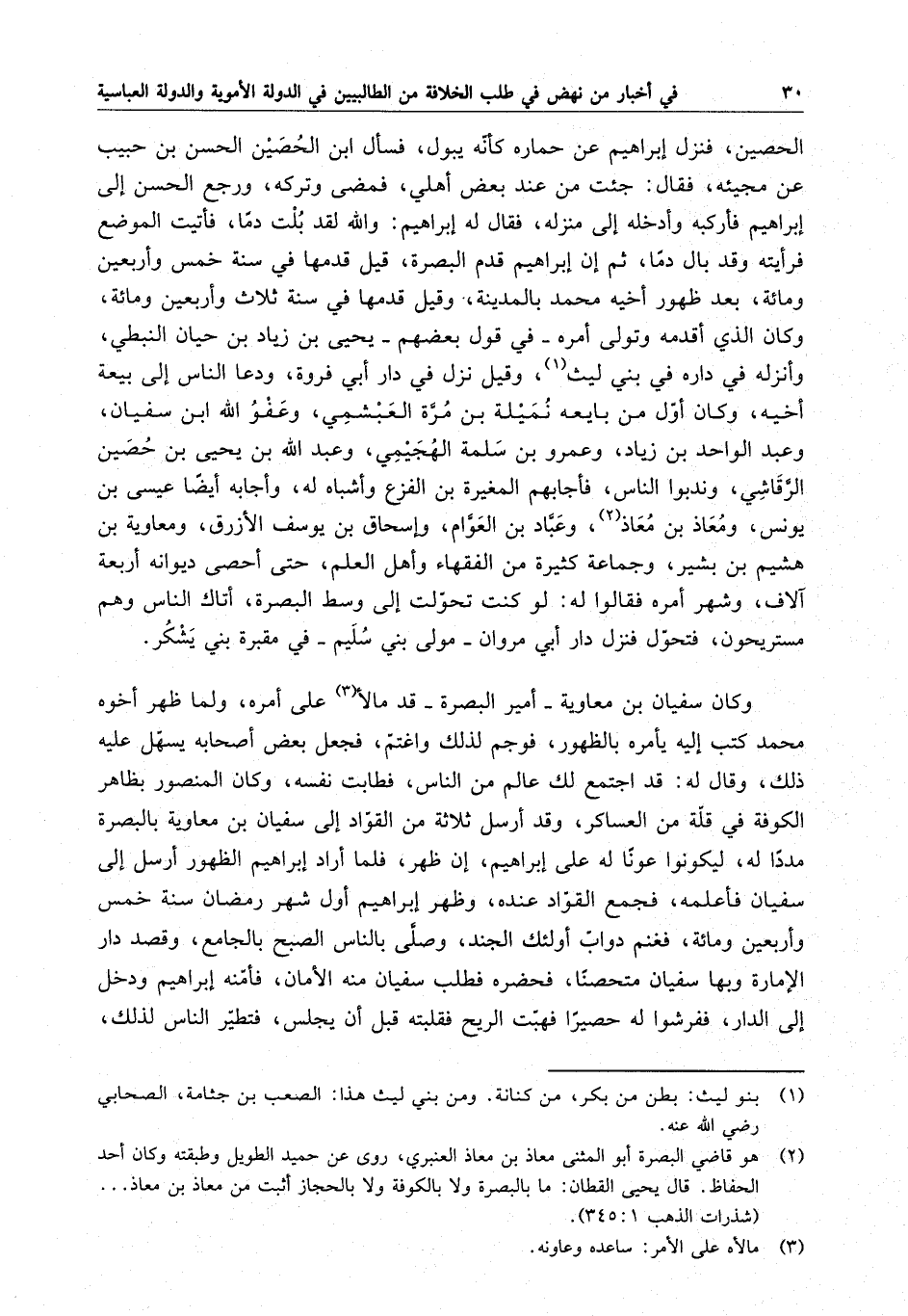 الحصين ، فنزل إبراهيم عن حماره كأنه يبول ، فسأل ابن الحصين الحسن بن حبيب عن مجيئه ، فقال : جئت من عند بعض أهلي ، فمضى وتركه ، ورجع الحسن إلى إبراهيم فأركبه وأدخله إلى منزله ، فقال له إبراهيم : والله لقد بلت دماً ، فأتيت الموضع فرأيته وقد بال دماً ، ثم إن إبراهيم قدم البصرة ، قيل قدمها في سنة خمس وأربعين ومائة ، بعد ظهور أخيه محمد بالمدينة ، وقيل قدمها في سنة ، ثلاث وأربعين ومائة ، وكان الذي أقدمه وتولى أمره - في قول بعضهم - يحيى بن زياد بن حيان النبطي ، وأنزله في داره في بني ليث ، وقيل نزل في دار أبي قروة ، ودعا الناس إلى بيعة أخيه ، وكان أو لمن بايعه نميل بن مرة العبشمي ، وعفو الله بن سفيان ، وعبد الواحد بن زياد ، وعمرو بن سلمة الجيمي ، وعبد الله ابن يحيى بن حصين الرقاشي ، وعبد الواحد بن زياد ، وعمرو بن سلمة الهجيمي ، وعبد الله ابن يحيى بن حصين الرقاشي ، وندبوا الناس ، فأجابهم المغيرة بن الفزع وأشباه له ، وأجابه أيضاً عيسى بن يونس ومعاذ بن معاذ ، وعباد بن العوام ، وإسحاق بن يوسف الأزرق ، ومعاوية بن هشيم ابن بشير ، وجماعة كثيرة من الفقهاء وأهل العلم ، حتى أحصى ديوانه أربعة آلاف ، وشهر أمره فقالوا له : لو كنت تحولت إلى وسط البصرة ، أتاك الناس وهم مستريحون ، فتحول فنزل دار أبي مروان - مولى بن سليم - في مقبرة بني يشكر . ار أبي مروان - مولى بن سليم - في مقبرة بني يشكر .