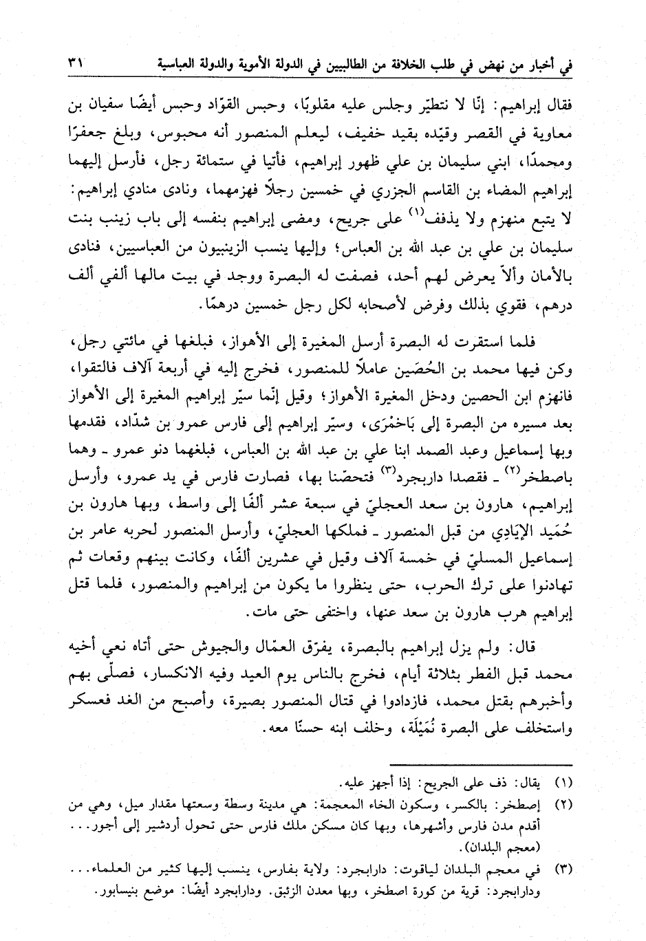 فقال إبراهيم : إنا لا نتطير وجلس عليه مقلوباً ، وحبس القواد وحبس أيضاً سفيان بن معاوية في القصر وقيده بقيد خفيف ، ليعلم المنصور أنه محبوس ، وباغ جعفر ومحمداً ، ابني سليمان بن علي ظهور إبراهيم ، فأتيا في ستمائة رجل ، فأرسل إليهما إبراهيم المضاء ابن القاسم اجزري في خمسين رجلاً فهزمهما ، ونادى منادي إبراهيم : لا يتبع منهزم ولا يدفق على جريح ، ومضى إبراهيم بنفسه إلى باب زينب بنت سليمان بن علي بن عبد الله بن العباس ؛ وإليها ينسب الزينبيون من العباسيين ، فنادى بالأمان وألا يعرض لهم أحد ، فصفت له البصرة ووجد في بيت ما لها ألفى ألف درهم ، فقوى بذلك وفرض لأصحابه لكل رجل خمسين درهماً .