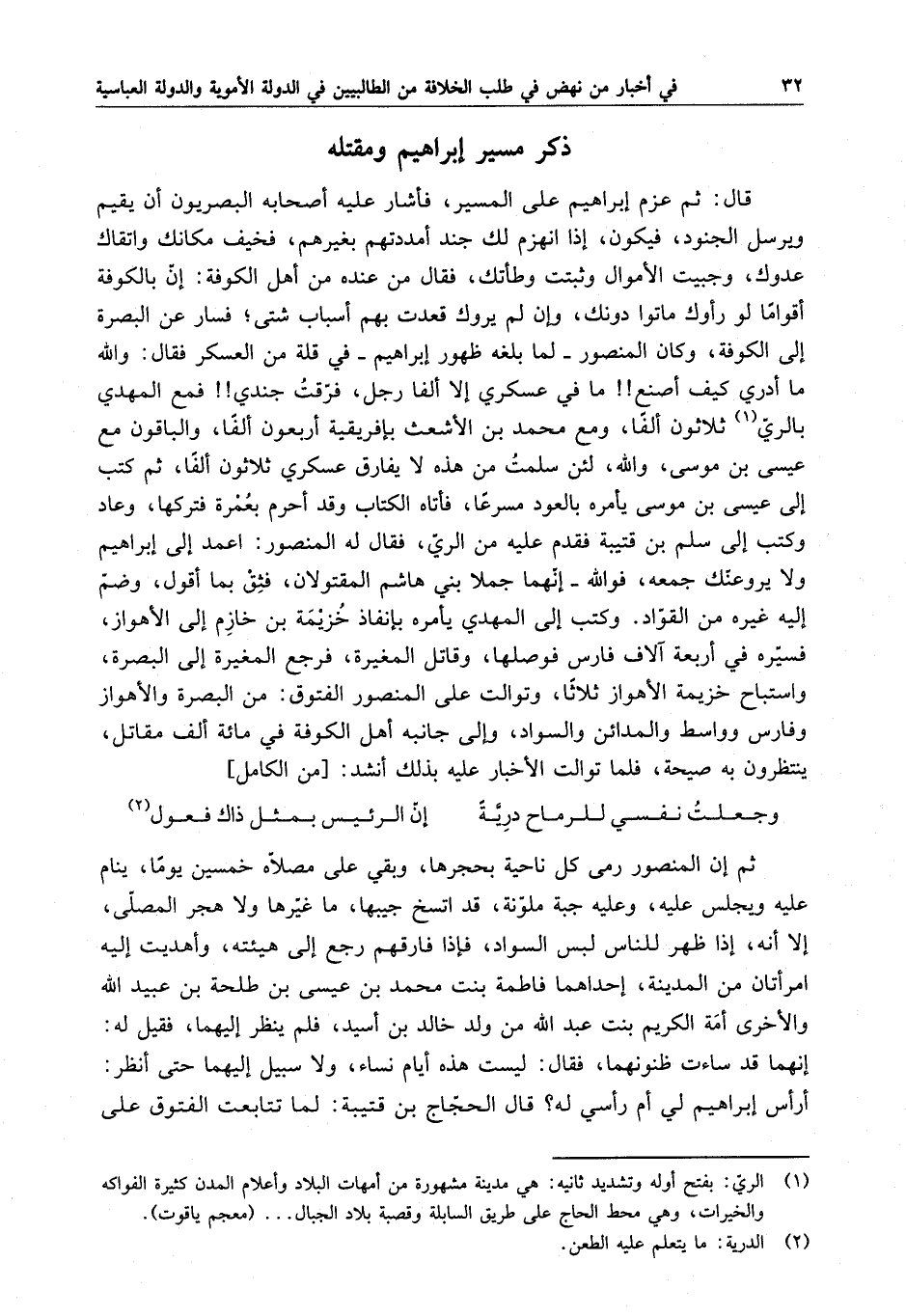 قال : ثم عزم إبراهيم على السير ، فأشار عليه أصحابه البصريون أن يقيم ويرسل الجنود ، فيكون ، إذا انهزم لك جند أمدتهم بغيرهم ، فخيف مكانك واتقاك عدوك ، وجبيت الأموال وثبتت وطأتك ، فقال من عنده من أهل الكوفة : إن بالكوفة أقاماً لو رأوك ماتوا دونك ، وإن لم يروك قعدت بهم أسباب شتى ؛ فسار عن البصرة إلى الكوفة ، وكان المنصور - لما بلغه ظهور إبراهيم - في قلة من العسكر فقال : والله ما أدري كيف أصنع ما في عسكري إلا ألفا رجل ، فرقت جندي فمع المهدي بالري ثلاثون ألفاً ، ومع محمد بن الأشعث بأفريقية أربعون ألفاً ، والباقون مع عيسى بن موسى ، والله ، لئن سلمت من هذه لا يفارق عسكري ثلاثون ألفاً ، ثم كتب إلى عيسى بن موسى بالعود مسرعاً ، فأتاه الكتاب وقد أحرم بعمرة فتركها ، وعاد وكتب إلى سلم بن قتيبة فقدم عليه من الري ، فقال له المنصور : اعمد إلى إبراهيم ولا يروعنك جمعة ، فوالله - إنهما جملا بني هاشم المقتولان ، فثق بما أقول ، وضم إليه غيره من القواد . وكتب إلى المهدي يأمره بإنفاذ جريمة بن خازم إلى الأهواز ، فسيره في أربعة آلاف فارس فوصلها ، وقاتل المغيرة ، فرجع المغيرة إلى البصرة ، واستباح خزيمة الأهواز ثلاثاً ، وتوالت على المنصور الفتوق : من البصرة والأهواز وفارس وأواسط والمداين والسواد ، وإلى جانبه أهل الكوفة في مائة ألف مقاتل ، ينتظرون به صيحة ، فلما توالت الأخبار عليه بذلك أنشد :