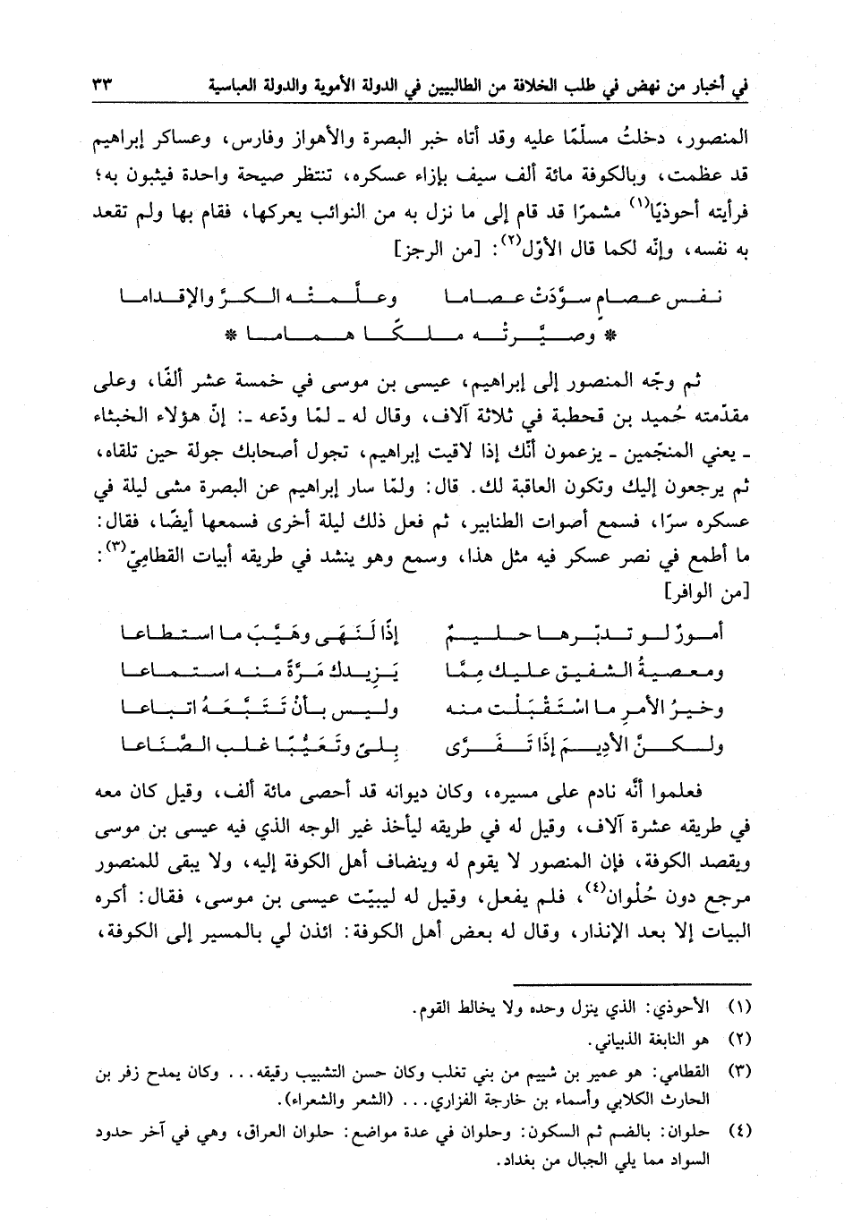 ثم وجه المنصور إلى إبراهيم ، عيسى بن موسى في خمسة عشر ألفاً ، وعلى مقدمته حميد بن قحطبة في ثلاث آلاف ، وقال له - لما ودعه - : إن هؤلاء الخبثاء - يعني المنجمين - يزعمون أنك إذا لاقيت إبراهيم ، تجول أصحابك جولة حين تلقاه ، ثم يرجعون إليك وتكون العاقبة لك . قال : ولما سار إبراهيم عن البصرة مشى ليلة في عسكره سراً ، فسمع أصوات الطنابير ، ثم فعل ذلك ليلة أخرى فسمعها أيضاً ، فقال : ما أطمع في نصر عسكر فيه مثل هذا ، وسمع وهو ينشد في طريقه أبيات القطامى :