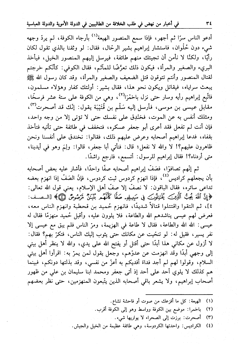 ثم إنهم تصادفوا ، فصف إبراهيم أصحابه صفاً واحداً ، فأشار عليه بعض أصحابه بأن يجعلهم كراديس ، فإذا انهزم كردوس ثبت كردوس ، فإن الصف إذا انهزم بعضه تداعى سائره ، فقال الباقون : لا نصف إلا صف أهل الإسلام ، يعني قول الله تعالى " إن الله يحب الذين يقاتلون في سبيله صفاً كأنهم بنيان مرصوص " ، ثم التوا واقتتلوا قتالاً شديداً ، فانهزم حميد بن قحطبة وانهزم الناس معه ، فعرض لهم عيسى يناشدهم الله والطاعة ، فلا يلوون عليه ، وأقبل حميد منهزماً فقال له عيسى : الله الله والطاعة ، فقال لا طاعة في الهزيمة ، ومر الناس فلم يبق مع عيسى إلا نفر يسير ، فيقيل له : أو تنحيت عن مكانك حتى يثوب إليك الناس ، فتكر بهم ؟ فقال : لا أزول عن مكاني هذا أبداً حتى أقتل أو يفتح الله على يدي ، والله لا ينظر أهل بيتي إلى وجهي أبداً وقد انهزمت عن عدوهم ، وجعل يقول لمن يمر به : إقرأوا أهل بيتي السلام ، وقولوا لهم لم أجد فداء أفديكم به أعز من نفسي ، وقد بذلتها دونكم ، فبينما هو كذلك لا يلوي أحد على أحد إذ أتى جعفر ومحمد ابنا سليمان بن علي بن ظهور أصحاب إبراهيم ، ولا يشعر باقي أصحابه الذين يتبعون المنهزمين ، حتى نظر بعضهم