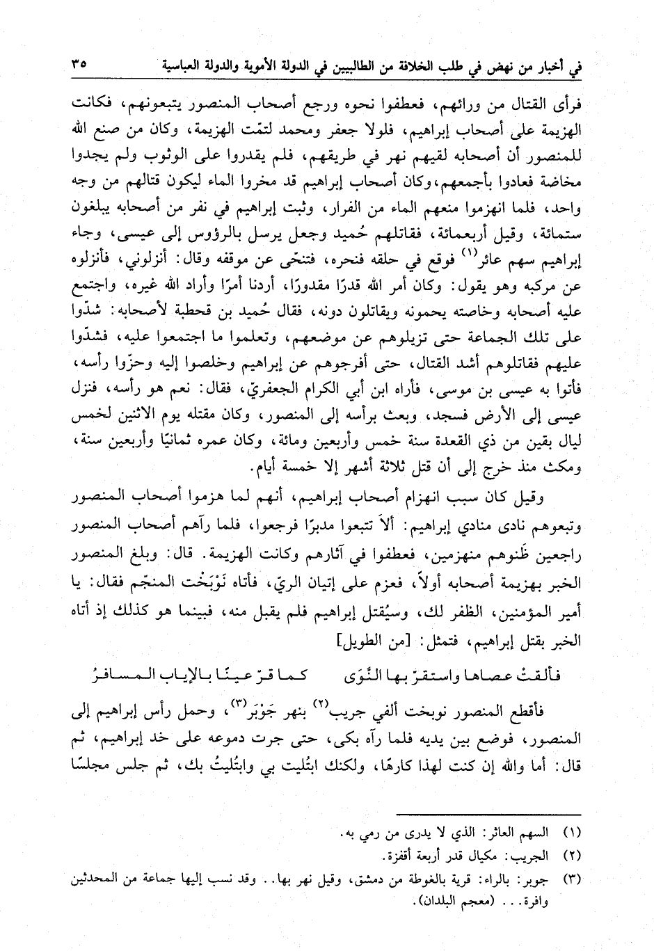 فرأى القتال من ورائهم ، فعطفوا نحوه ورجع أصحاب المنصور يتبعونهم ، فكانت الهزيمة على أصحاب إبراهيم ، فلولا جعفر ومحمد لتمت الهزيمة ، وكان من صنع الله للمنصور أن أصحابه لقيهم نهر في طريقهم ، فلم يقدروا على الوثوب ولم يجدوا مخاضة فعادوا بأجمعهم ، وكان أصحاب إبراهيم قد مخروا الماء ليكون قتالهم من وجه واحد ، فلما انهزموا منعهم الماء من الفرار ، وثبت إبراهيم في نفر من أصحابه يبلغون ستمائة ، وقيل أربعمائة ، فقاتلهم حميد وجعل يرسل بالرؤوس إلى عيسى ، وجاء إبراهيم سهم عائر فوقع في حلقه فنحره ، فتنحى عن موقفه وقال : أنزلوني ، فأنزلوه عن مركبه وهو يقول : وكان أمر الله قدراً مقدوراً ، أردنا أمراً وأراد الله غيره ، واجتمع عليه أصحابه وخاصته يحمونه ويقاتلون دونه ، فقال حميد بن فحطبة لأصحابه : شدوا على تلك الجماعة حتى تزيلوهم عن موضعهم ، وتعلموا ما اجتمعوا عليه ، فشدوا عليهم فقاتلوهم أشد القتال ، حتى أفرجوهم عن إبراهيم وخلصوا إليه وحزّوا رأسه ، فأتوا به عيسى بن موسى ، فأراه ابن أبي الكرام الجعفري ، فقال : نعم هو رأسه ، فنزل عيسى إلى الأرض فسجد ، وبعث برأسه إلى المنصور ، وكان مقتله يوم الإثنين لخمس ليال بقين من ذي القعدة سنة خمس وأربعين ومائة ، وكان عمره ثمانيا وأربعين سنة ، ومكث منذ خرج إلى أن قتل ثلاث أشهر إلا خمسة أيام . وقيل كان سبب انهزام أصحاب إبراهيم ، أنهم لما هزموا أصحاب المنصور وتبعوهم نادى منادي إبراهيم : ألا تتبعوا مدبرا فرجعوا ، فلما رآهم أصحاب المنصور راجعين ظنوهم منهزمين ، فعطفوا في آثارهم وكانت الهزيمة . قال : وبلغ المنصور الخبر بهزيمة أصحابه أولاً ، فعزم على اتيان الري ، فأتاه نوبخت المنجم فقال : يا أمير المؤمنين ، الظفر لك ، وسيقتل إبراهيم فلم يقبل منه ، فبينما هو كذلك إذ أتاه الخبر بقتل إبراهيم ، فتمثل :