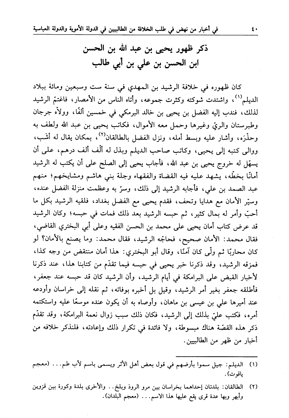 كان ظهوره في خلافة الرشيد بن المهدي في سنة ست وسبعين ومائة ببلاد الديلم ، واشتدت شوكته وكثرت جموعه ، وأتاه من الأمصار ، فاغتم الرشيد لذلك ، فندب إليه الفضل بن يحيى بن خالد البرمكي في خمسين ألفاً ، وولاه جرجان وطبرستان والري وغيرها وحمل معه الأموال ، فكاتب يحيى بن عبد الله ولطف به وحذره ، وأشار عليه وبسط أمله ، ونزل الفضل بالطالقان ، بمكان يقال له أشب ، ووالى كتبه إلى يحيى ، وكاتب صاحب الديلم وبذل له ألف ألف درهم ، على أن يسهل له خروج يحيى بن عبد الله ، فأجاب يحيى إلى الصلح على أن يكتب له الرشيد أماناً بخطه ، يشهد عليه فيه القضاة والفقهاء وجلة بني هاشم ومشايخهم ؛ منهم عبد الصمد بن علي ، فأجابه الرشيد إلى ذلك ، وسرّ به وعظمت منزلة الفضل عنده ، وسيّر الأمان مع هدايا وتحف ، فقدم يحيى مع الفضل بغداد ، فلقيه الرشيد بكل ما أحب وأمر له بمال كثير ، ثم حبسه الرشيد بعد ذلك فمات في حبسه ؛ وكان الرشيد قد عرض كتاب أمان يحيى على محمد بن الحسن الفقيه وعلى أبي البختري القاضي ، فقال محمد : الأمان صحيح ، فحاجه الرشيد ، فقال محمد : وما يصنع بالأمان ؟ لو كان محارباً ثم ولىّ كان آمنا ، وقال أبو البختري : هذا أمان منتقض من وجه كذا ، فمزقه الرشيد ، وقد ذكرنا خبر يحيى في حبسه فيما تقدم من كتابنا هذا ، عند ذكرنا لأخبار القبض على البرامكة في أيام الرشيد ، وأن الرشيد كان قد حبسه عند جعفر ، فأطلقه جعفر بغير أمر الرشيد ، وقيل بل أخبره بوفاته ، ثم نقله إلى خراسان وأودعه عند أميرها على ابن عيسى بن ماهان ، وأوصاه به أن يكون عنده موسعاً عليه واستكتمه أمره ، فكتب علي بذلك إلى الرشيد ، فكان ذلك سبب زوال نعمة البرامكة ، وقد تقدم ذكر هذه القصة هناك مبسوطة ، ولا فائدة في تكرار ذلك وإعادته ، فلنذكر خلافه من أخبار من ظهر من الطالبيين .