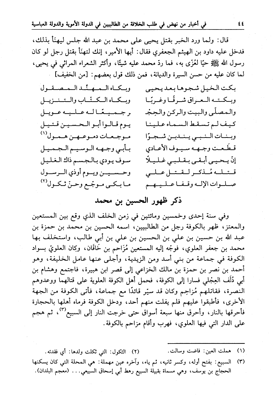 قال : ولما ورد الخبر بقتل يحيى على محمد بن عبد الله جلس ليهنأ بذلك ، فدخل عليه داود بن الهيثم الجعفري فقال : أيها الأمير ، إنك لتهنأ بقتل رجل لو كان رسول الله ( صلى الله عليه وسلم ) حياً لعزى به ، فما رد محمد عليه شيئاً ، وأكثر الشعراء المراثى في يحيى ، لما كان عليه من حسن السيرة والديانة ، فمن ذلك قول بعضهم :