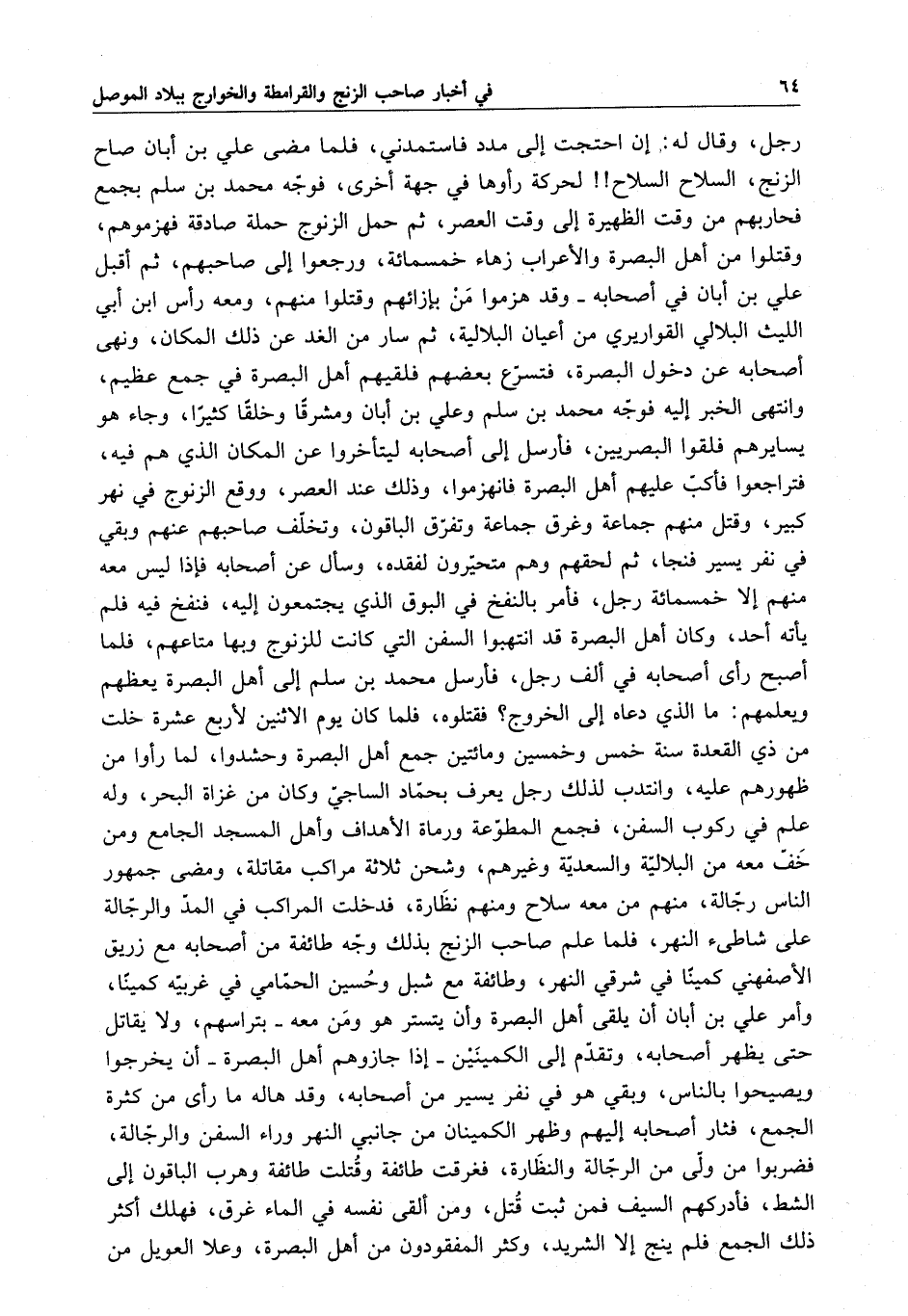 رجل ، وقال له : إن احتجت إلى مدد فاستمدني ، فلما مضى على بن أبان صاح الزنج ، السلاح السلاح لحركة رأوها في جهة أخرى ، فوجه محمد بن سلم بجمع فحاربهم من وقت الظهيرة إلى وقت العصر ، ثم حمل الزنوج حملة صادقة فهزموهم ، وقتلوا من أهل البصرة والأعراب زهاء خمسمائة ، ورجعوا إلى صاحبهم ، ثم أقبل علي بن أبان في أصحابه - وقد هزموا من بإزائهم وقتلوا منهم ، ومعه رأس ابن أبي الليث البلالي القواريري من أعيان البلالية ، ثم سار من الغد عن ذلك المكان ، ونهى أصحابه عن دخول البصرة ، فتسرع بعضهم فلقيهم أهل البصرة في جمع عظيم ، وانتهى الخبر إليه فوجه محمد بن سلم وعلي بن أيان ومشرقاً وخلقاً كثيراً ، وجاء هو يسايرهم فلقوا البصريين ، فأرسل إلى أصحابه ليتأخروا ، عن المكان الذي فيه ، فتراجعوا فأكب عليهم أهل البصرة فانهزموا ، وذلك عند العصر ، ووقع الزنوج في نهر كبير ، وقتل منهم جماعة وغرق جماعة وتفرق الباقون ، وتخلف صاحبهم عنهم وبقي في نفر يسير فنجاً ، ثم لحقهم وهو متحيرون لفقده ، وسأل عن أصحابه فإذا ليس معه منهم إلا خمسمائة رجل ، فأمر بالنفخ في البوق الذي يجتمعون إليه ، فنفخ فيه فلم يأته أحد ، وكان أهل البصرة قد انتهبوا السفن التي كانت للزنوج وبها متاعهم ، فلما أصبح رأى أصحابه في ألف رجل ، فأرسل محمد بن سلم إلى البصرة يعظهم ويعلمهم : ما الذي دعاه إلى الخروج ؟ فقتلوه ، فلما كان يوم الاثنين لأربع عشرة خلت من ذي القعدة سنة خمس وخمسين ومائتين جمع أهل البصرة وحشدوا ، لما رأوا من ظهورهم عليه ، وانتدب لذلك رجل يعرف بحماد الساجي وكان من غزاة البحر ، وله علم في ركوب السفن ، فجمع المطوعة ورماة الأهداف وأهل المسجد الجامع ومن خف معه من البلالية والسعدية وغيرهم ، وشحن ثلاثة مراكب مقاتلة ، ومضى جمهور الناس رجالة ، منهم من معه سلاح ومنهم نظارة ، فدخلت المراكب في المد والرجالة على شاطىء النهر ، فلما علم صاحب الزنج بذلك وجه طائفة من أصحابه مع زريق الأصفهاني كمينا في شرفي النهر ، وطائفة مع شبل وحسين الحمامي في غربية كمينا ، وأمر علي بن أبان أن يلقي أهل البصرة وأن يتستر هو ومن معه - بتراسهم ، ولا يقاتل حتى يظهر أصحابه ، وتقدم إلى الكمينين - إذا جازوهم أهل البصرة - أن يخرجوا ويصيحوا بالناس ، وبقى هو في نفر يسير من أصحابه ، وقد هاله ما رأى من كثرة الجمع ، فثار أصحابه إليهم وظهر الكمينان من جانبي النهر وراء السفن والرحالة ، فضربوا من ولى من الرجالة والنظارة ، فغرقت طائفة وقتلت طائفة وهرب الباقون إلى الشط ، فأدركهم السيف فمن ثبت قتل ، ومن ألقى نفسه في الماء غرق ، فهلك أكثر ذلك الجمع فلم ينج إلا الشريد ، وكثر المفقودون من أهل البصرة ، وعلا العويل من