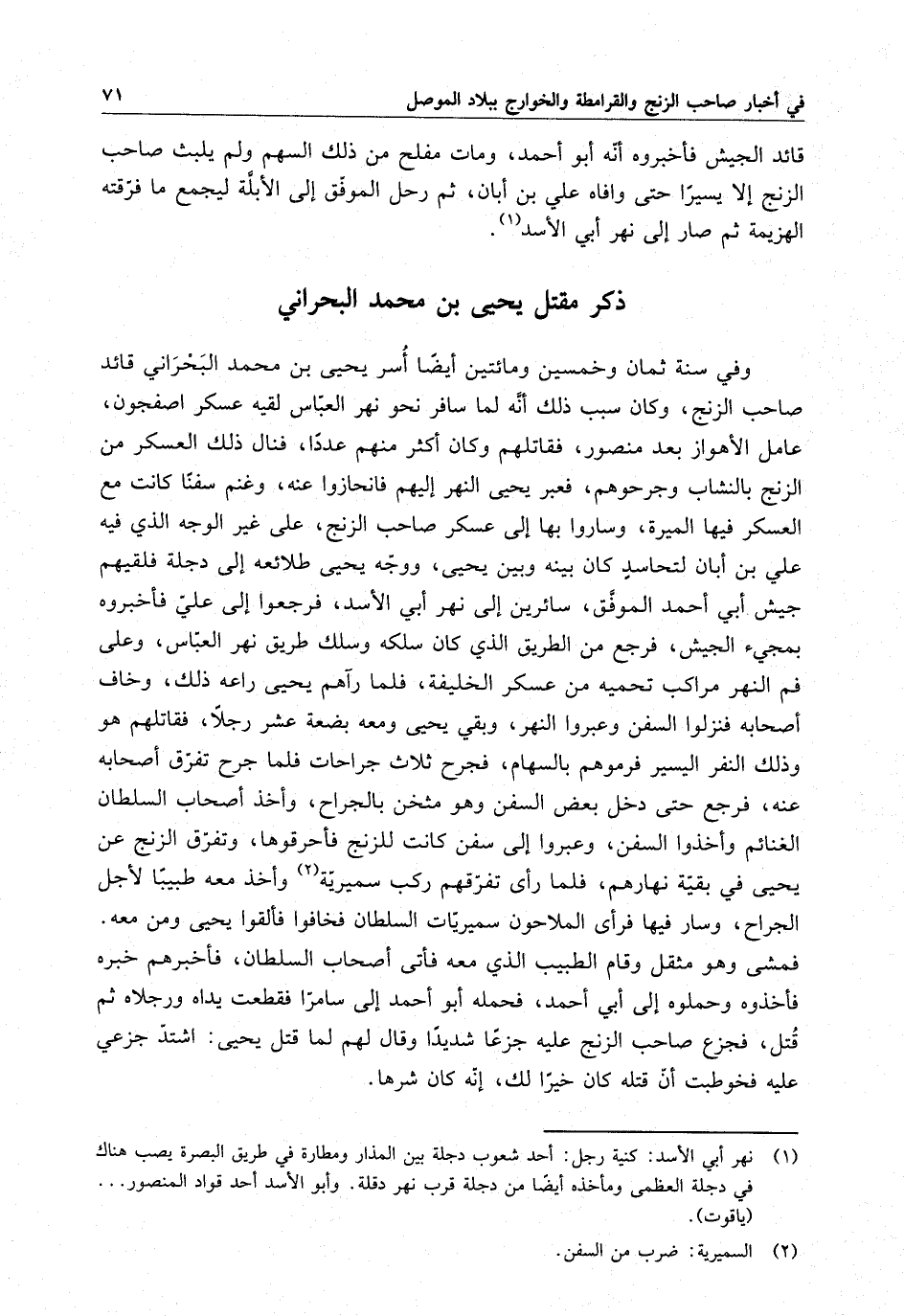وفي سنة ثمان وخمسين ومائتين أيضاً أسر يحيى بن محمد البحراني قائد صاحب الزنج ، وكان سبب ذلك أنه لما سافر نحو العباس لقيه عسكر اصفجون ، عامل الأهواز بعد منصور ، فقاتلهم وكان أكثر منهم عدداً ، فنال ذلك العسكر من الزنج بالنشاب وجرحوهم ، فعبر يحيى النهر إليهم فانحازوا عنه ، وغنم سفناً كانت مع العسكر فيها الميرة ، وساروا بها إلى عسكر صاحب الزنج ، على غير الوجه الذي فيه علي بن أبان لتحاسد كان بينه وبين يحيى ، ووجه طلائعه إلى دجلة فلقيهم جيش أبي أحمد الموفق ، سائرين إلى نهر أبي الأسد ، فرجعوا إلى علي فأخبروه بمجيء الجيش ، فرجع من الطريق الذي كان سلكه وسلك طريق نهر العباس ، وعلى فم النهر مراكب تحميه من عسكر الخليفة ، فلما رآهم يحيى راعه ذلك ، وخاف أصحابه فنزلوا السفن وعبروا النهر ، وبقي يحيى ومعه بضعة عشر رجلاً ، فقاتلهم هو وذلك النفر اليسير فرموهم بالسهام ، فجرح ثلاث جرحات فلما جرح تفرق أصحابه عنه ، فرجع حتى دخل بعض السفن وهو مثخن بالجراح ، وأخذ أصحاب السلطان الغنائم وأخذوا السفن ، وعبروا إلى سفن كانت للزنج فأحرقوها ، وتفرق الزنج عن يحيى في بقية نهارهم ، فلما رأى تفرقهم ركب سميرية وأخذ معه طبيباً لأجل الجراح ، وسار فيها فرأى الملاحون سميريات السلطان فخافوا فألقوا يحيى ومن معه ، فمشى وهو مثقل وقام الطبيب الذي معه فأتى أصحاب السلطان ، فأخبرهم خبره فأخذوه وحملوه إلى أبي أحمد ، فحمله أبو أحمد إلى سامراً فقطعت يداه ورجلاه ثم قتل ، فجزع صاحب الزنج عليه جزعاً شديداً وقال لهم لما قتل يحيى : اشتد جزعي عليه فخوطبت أن قتله كان خيراً لك ، إنه كان شرها .