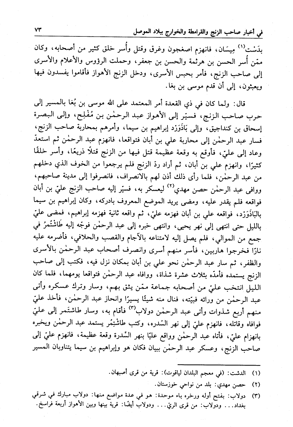 بدست ميسان ، فانهزم اصغجون وغرق وقتل وأسر خلق كثير من أصحابه ، وكان ممن أسر الحسن بن هرثمة والحسن بن جعفر ، وحملت الرؤوس والأعلام والأسرى إلى صاحب الزنج ، فأمر بحبس الأسرى ، ودخل الزنج الأهواز فأقاموا يفسدون فيها ويعبثون ، إلى أن قدم موسى بن بغا . قال : ولما كان في ذي القعدة أمر المعتمد على الله أن قدم موسى بن بغا بالمسير إلى حرب صاحب الزنج ، فسير إلى الأهواز عبد الرحمن بن مفلح ، وإلى البصرة إسحاق بن كنداجيق ، وإلى باذاورد إبراهيم بن سيما ، وأمرهم بمحاربة صاحب الزنج ، فسار عبد الرحمن إلى محاربة على ابن أبان فتواقعا ، فانهزم عبد الرحمن ثم استعد وعاد إلى علي ، فأوقع به وقعة عظيمة قتل فيها من الزنج قتلاً ذريعاً ، وأسر خلقاً كثيراً ، وانهزم علي بن أبان ، ثم أراد رد الزنج فلم يرجعوا من الخوف الذي دخلهم من عبد الرحمن ، فلما رأى ذلك أذن لهم بالانصراف ، فانصرفوا إلى مدينة صاحبهم ، ووافى عبد الرحمن حصن مهدي ليعسكر به ، فسير إليه صاحب الزنج علي بن أبان فوافقة فلم يقدر عليه ، ومضى يريد الموضع بادركه ، وكان إبراهيم بن سيما بالباذا ورد ، فواقعه على بن أبان فهزمه علي ، ثم واقعة ثانية فهزمه إبراهيم ، فمضى علي بالليل حتى انتهى إلى نهر يحيى ، وانتهى خبره إلى عبد الرحمن فوجه إليه طاشتمر في جمع من الموالي ، فلم يصل إليه لامتناعه بالآجام والقصب والحلافي ، فأضرمه عليه ناراً فخرجوا هاربين ، فأسر منهم أسرى وانصرف أصحاب عبد الرحمن بالأسرى والظفر ، ثم سار عبد الرحمن نحو علي بن أبان بمكان نزل فيه ، فكتب إلى صاحب الزنج يستمده فأمده بثلاث عشرة شذاة ، ووافاه عبد الرحمن فتواقعا يومهما ، فلما كان الليل انتخب علي من أصحابه جماعة ممن يثق بهم ، وسار وترك عسكره وأتى عبد الرحمن من ورائه فبينه ، فنال منه شيئاً يسيراً وانحاز عبد الرحمن ، فأخذ علي منهم أربع شذوات وأتى عبد الرحمن دولاب فأقام به ، وسار طاشتمر إلى علي فوافاه وقاتله ، فانهزم علي إلى نهر السدرة ، وكتب طاشتمر يستمد عبد الرحمن ويخبره بانهزام علي ، فأتاه عبد الرحمن وواقع علياً بنهر السدرة وقعة عظيمة ، فانهزم علي إلى صاحب الزنج ، وعسكر عبد الرحمن ببيان فكان هو وإبراهيم بن سيما يتناوبان المسير