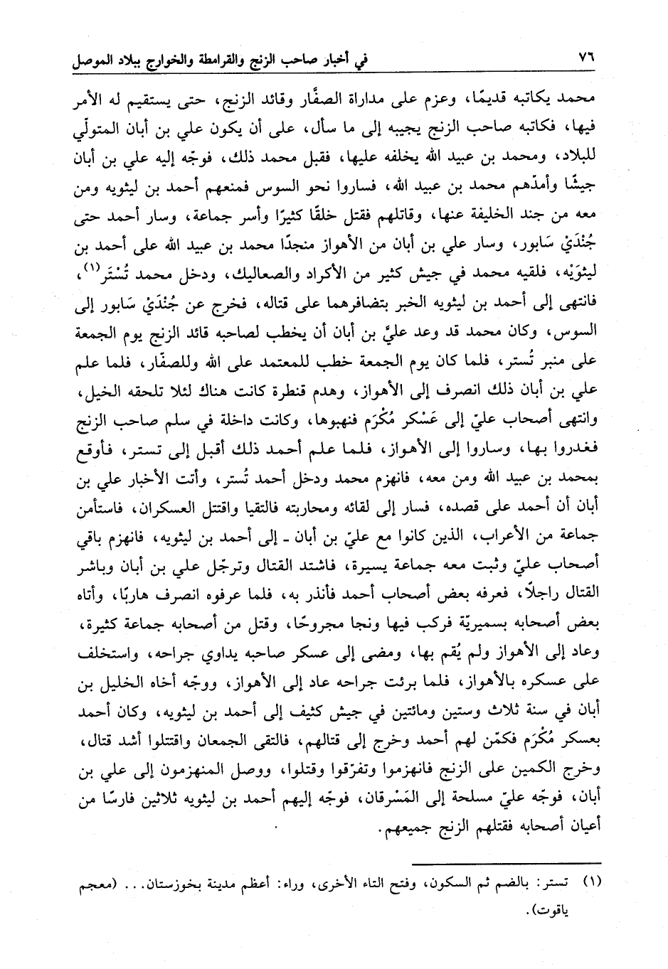محمد يكاتبه قديماً ، وعزم على مداراة الصفار وقائد الزنج ، حتى يستقيم له الأمر فيها ، فكاتبه صاحب الزنج يجيبه إلى ما سأل ، على أن يكون علي بن أبان المتولي للبلاد ، ومحمد بن عبيد الله يخلفه عليها ، فقبل محمد ذلك ، فوجه إليه علي بن أبان جيشاً وأمدهم محمد بن عبيد الله ، فساروا نحو السوس فمنعهم أحمد بن ليثوية ومن معه من جند الخليفة عنها ، وقاتلهم فقتل خلقاً كثيراً وأسر جماعة ، وسار أحمد حتى جندي سابور ، وسار علي بن أبان من الأهواز منجداً محمد بن عبيد الله على أحمد بن ليثوية ، فلقيه محمد في جيش كثير من الأكراد والصعاليك ، ودخل محمد تستر ، فانتهى إلى أحمد بن ليثوية الخبر بتضافرهما على قتاله ، فخرج عن جندي سابور إلى السوس ، وكان محمد قد وعد علي بن أبان أن يخطب لصاحبه قائد الزنج يوم الجمعة على منبر تستر ، فلما علم علي بن أبان ذلك انصرف إلى الأهواز ، وهدم قنطرة كانت هناك لئلا تلحقه الخيل ، وانتهى أصحاب علي إلى عسكر مكرم فنهبوها ، وكانت داخلة في سلم صاحب الزنج فغدوا بها ، وسار إلى الأهواز ، فلما علم أحمد ذلك أقبل إلى تستر ، فأوقع بمحمد بن عبيد الله ومن معه ، فانهزم محمد ودخل أحمد تستر ، وأتت الأخبار على بن أبان أن أحمد على قصده ، فسار إلى لقائه ومحاربته فالتقيا واقتتل العسكران ، فاستأمن جماعة من الأعراب ، الذين كانوا مع علي بن أبان - إلى أحمد بن ليثوية ، فانهزم باقي أصحاب علي وثبت معه جماعة يسيره ، فاشتد القتال وترجل على بن أبان وباشر القتال راجلا ، فعرفه بعض أصحاب أحمد فأنذر به ، فلما عرفوه انصرف هارباً ، وأتاه بعض أصحابه بسميرية فركب فيها ونجا مجروحاً ، وقتل من أصحابه جماعة كثيرة ، وعاد إلى الأهواز ولم يقم بها ، ومضى إلى عسكر صاحبه يداوي جراحه ، واستحلف على عسكره بالأهواز ، فلما برئت جراحه عاد إلى الأهواز ، ووجه أخاه الخليل بن أبان في سنة ثلاث وستين ومائتين في جيش كثيف إلى أحمد بن ليثوية ، وكان أحمد بعسكر مكرم فكمن لهم أحمد وخرج إلى قتالهم ، فالتقى الجمعان واقتتلوا أشد القتال ، وخرج الكمين على الزنج فانهزموا وتفرقوا وقتلوا ، ووصل المنهزمون إلى علي بن أبان ، فوجه علي مسلحة إلى المسرقان ، فوجه إليهم أحمد بن ليثوية ثلاثين فارساً من أعيان أصحابه فقتلهم الزنج جميعهم .