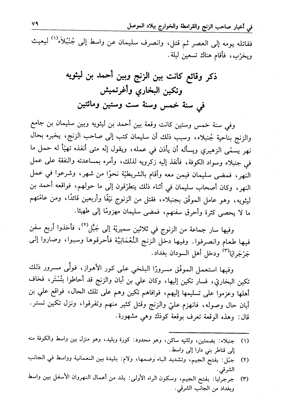 وفي سنة خمس وستين كانت وقعة بين أحمد بن ليثوية وبين سليمان بن جامع والزنج بناحية جنبلاء ، وسبب ذلك أن سليمان كتب إلى صاحب الزنج ، يخبره بحال نهر يسمى الزهيري ويسأله أن يأذن في عمله ، ويقول إنه متى أنفذه تهيأ له حمل ما في جنبلاء وسواد الكوفة ، فأنفذ إليه زكروية لذلك ، وأمره بمساعدته والنفقة على عمل النهر ، فمضى سليمان فيمن معه وأقام بالشريطية نحوا من شهر ، وشرعوا في عمل النهر ، وكان أصحاب سليمان في أثناء ذلك يتطرقون إلى ما حولهم ، فواقعة أحمد بن ليثوية ، وهو عامل الموفق بجنبلاء ، فقتل من الزنوج نيفاً وأربعين قائداً ، ومن عامتهم ما لا يحصى كثرة وأحرق سفنهم ، فمضى سليمان مهزوماً إلى طهيثا .